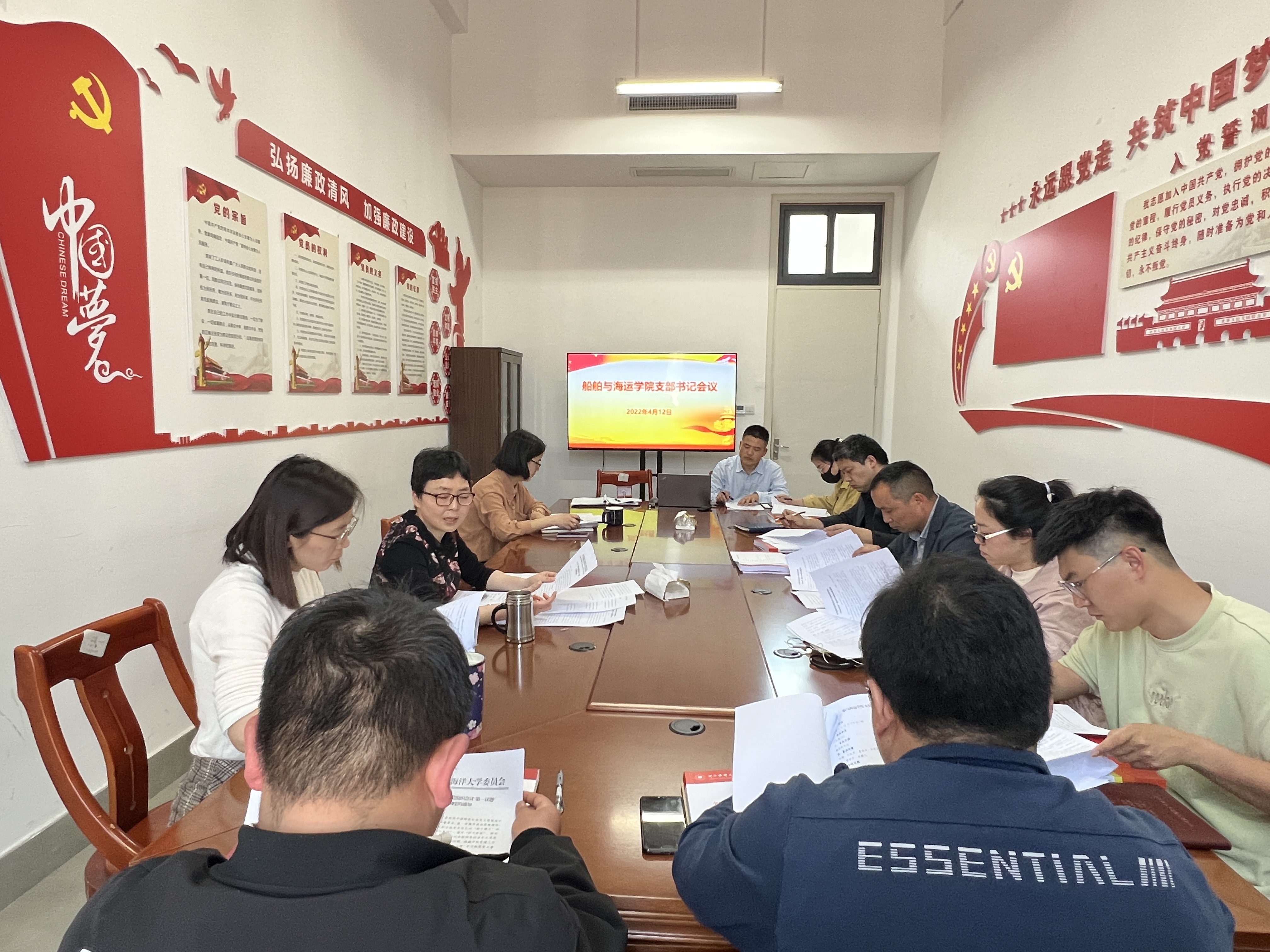 会议学习了学校“第一议题”制度,《中共教育部党组关于高校党组织“对标争先”建设计划的实施意见》和《新时代高校党建“双创”工作重点任务指南(基层党支部)》等文件,布置了学院2022年党建工作及意识形态工作,指出要以好的作风抓好党建工作,扎实落实好党建工作制度和工作任务,不断提升党建工作质量;要高度重视意识形态工作,全面提升党管意识形态工作水平,确保意识形态安全。航海本科生党支部书记严敏慧介绍了全国样板党支部培育创建经验,与会人员进行了交流讨论。