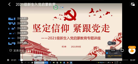 开展了2021级全体本科生、研究生新生入党启蒙教育。本次活动由学院党委副书记、纪委书记何晔书记主讲。因疫情防控需要,活动以线上直播的方式开展。