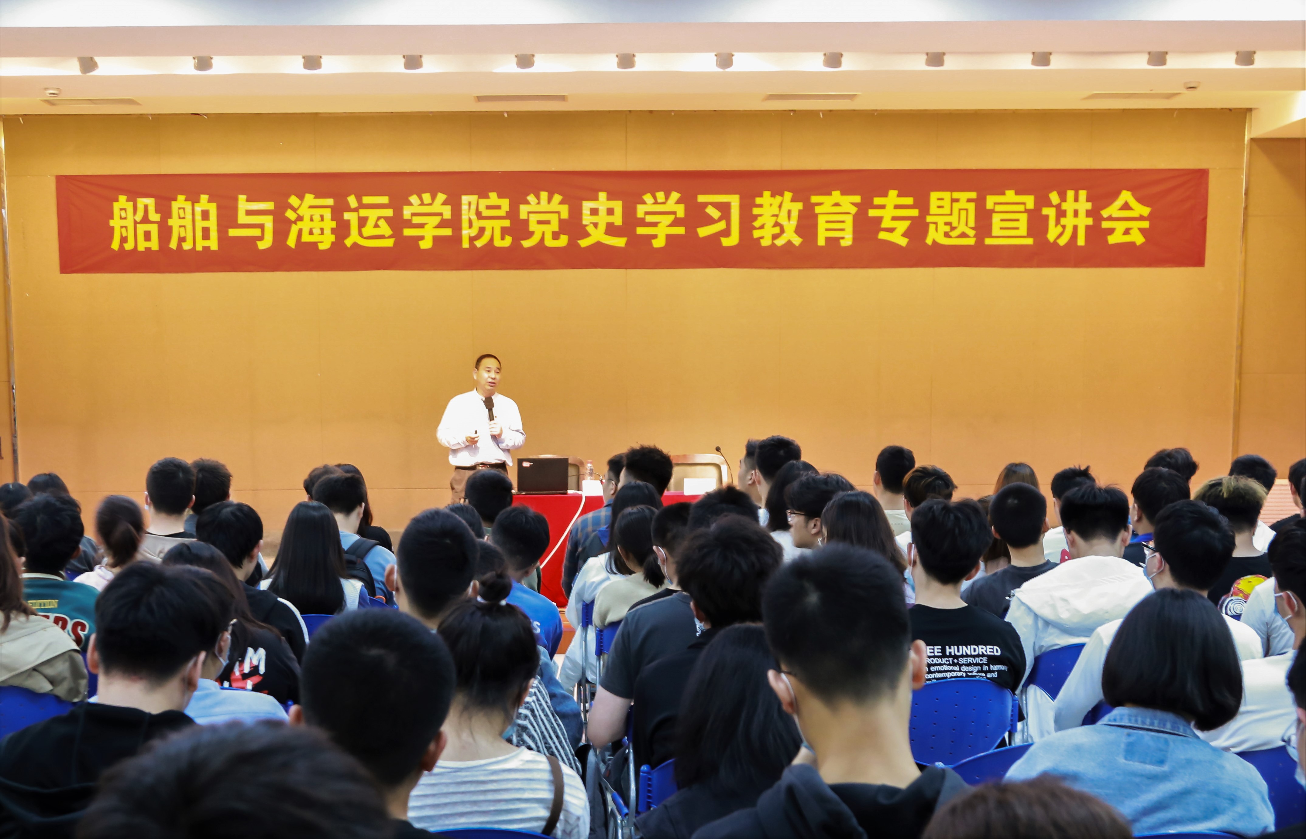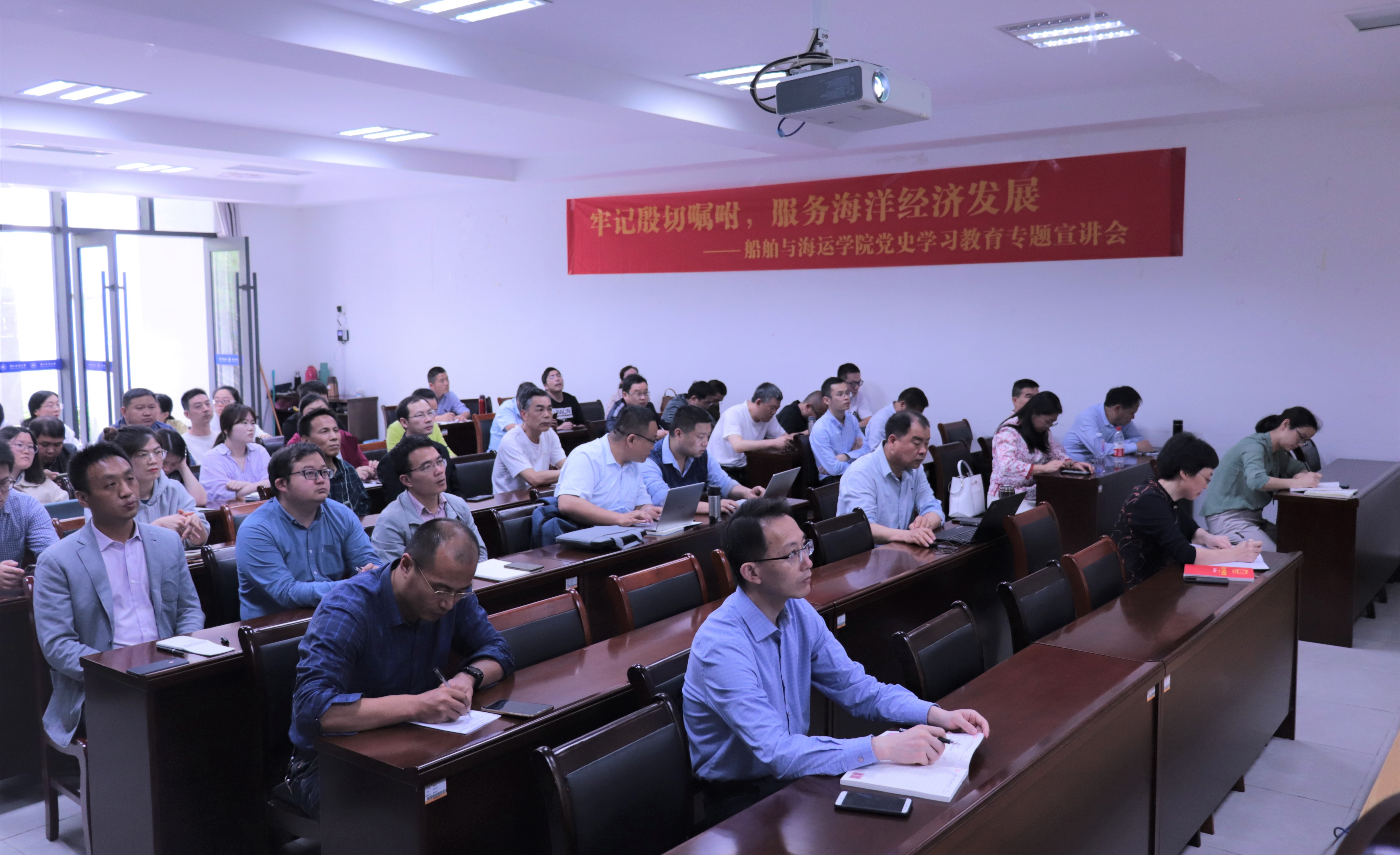 宣讲会上,王捷副书记首先指出党史学习目的就是要用党的奋斗历程和伟大成就鼓舞斗志、明确方向;用党的光荣传统和优良作风坚定信念、凝聚力量;用党的实践创造和历史经验启迪智慧、砥砺品格。王捷副书记围绕红色根脉、海洋思想、海洋情缘、殷切嘱咐等四个方面展开宣讲。他梳理了浙江省的红色历史沿革,尤其对舟山市内的红色资源作了重点介绍,鼓励全体党员到本市红色教育基地开展现场学习。他带领全体同志跟随习近平总书记14次舟山考察之行的步伐,领会海洋思想,体悟海洋情缘,使师生更好地理解了总书记对学校发展的殷切嘱咐,王捷副书记结合学院学科专业建设,解读了《浙江省推进高水平交通强省基础设施建设三年行动计划(2020—2022年)》。王捷副书记对教工党员的师德师风、思想政治素质、专业素质能力的发展和提升提出了希望和要求,嘱咐教工党员要对浙江对舟山发展充满信心,要坚持立德树人,为海洋经济建设培养更多优秀海洋人才;鼓励学生党员学好专业知识,锤炼过硬本领,为我国海洋经济的发展繁荣贡献力量。