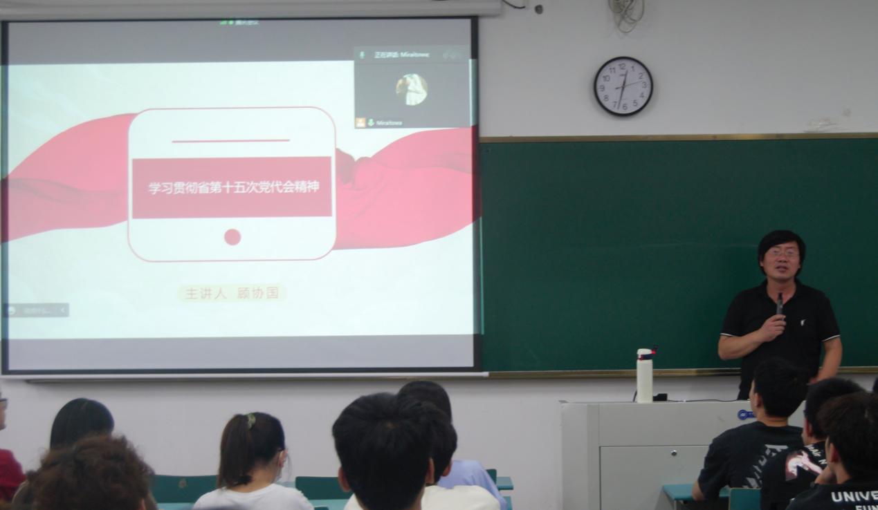 在教学楼335开展学习贯彻浙江省第十五次党代会精神辅导报告会,报告会由马克思主义学院顾协国副教授主讲,学院全体学生党员参加,学院党委副书记、纪委书记何晔主持报告会。