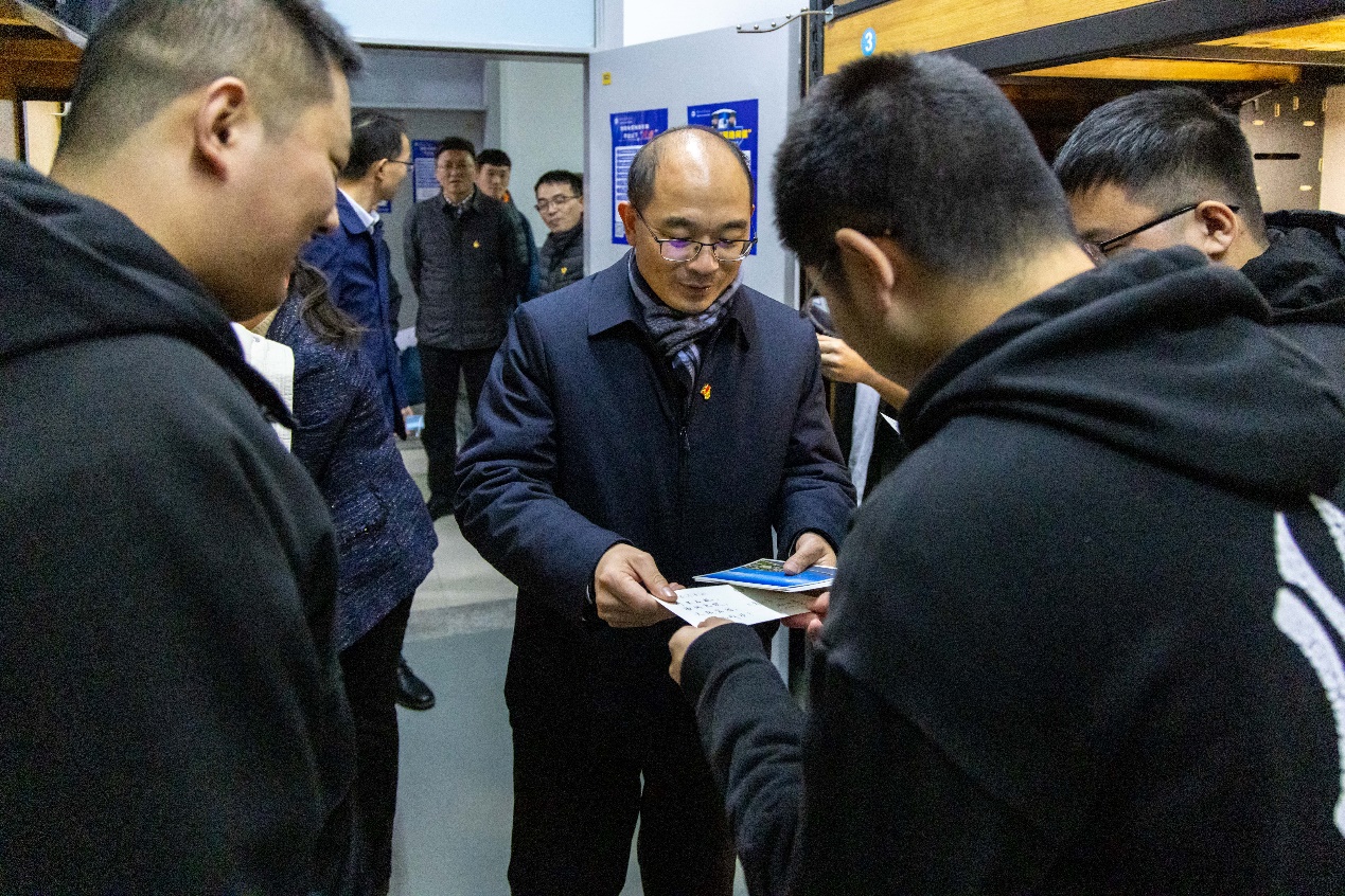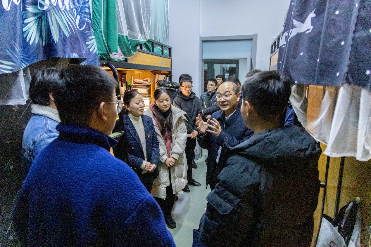 在T栋学生寝室,杨灿军亲切地询问同学们的生活、学习情况,听取同学们对学校发展的意见、建议,嘱咐同学们如果在生活、学习中遇到任何困难,除了学院、班主任、辅导员外,还可以积极寻求结对的机关第十一党支部帮助,学校将竭尽全力为大家提供帮助。针对学生现场提出的问题,杨灿军要求陪同相关部门列出时间表抓紧落实。当晚,杨灿军与学生党员深入交流二十大精神学习心得,希望学生党员做到“六个坚持”,鼓励同学们无论前路如何,都要胸怀天下,以从容地心态面对人生,以自信的态度迎接挑战。人生是多元化的,是丰富多彩的,勉励同学们要紧跟文化和科技的发展步伐,认真学习专业知识,树立远大理想,抓住时代机遇,实现人生理想,始终要做对人类发展有意义的事。