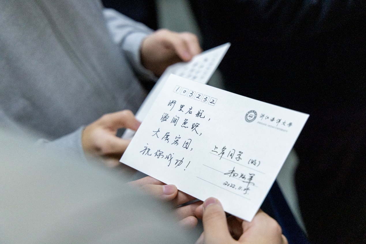 最后,杨灿军为几位同学送上了祝福礼包,亲自送上明信片,为同学们送去祝福。他祝福同学们“浙里启航,海阔鱼跃,大展宏图”, “浙海大祝你成功”的藏头诗让同学们满心欢喜,杨校长特别指出邮编“103232”,蕴含着“要你上岸上岸”的美好祝愿,无论考公、考编或其他形式就业,都祝福同学们顺利上岸,前途无量,同学们备受鼓舞。