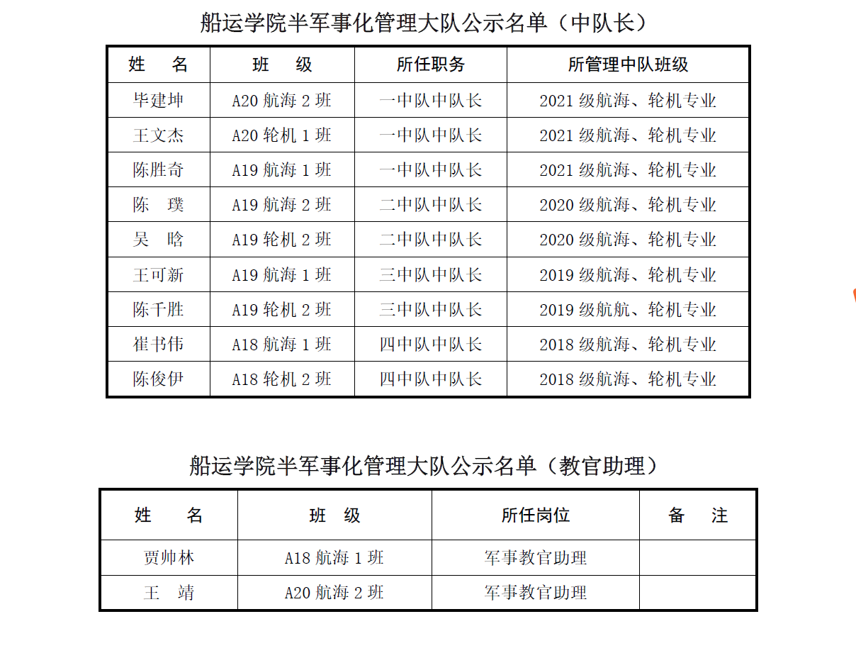 通过线上线下竞选,现公示半军管中队长、教官助理名单: