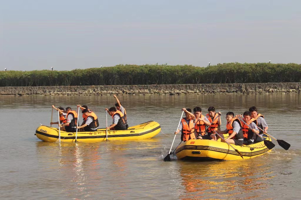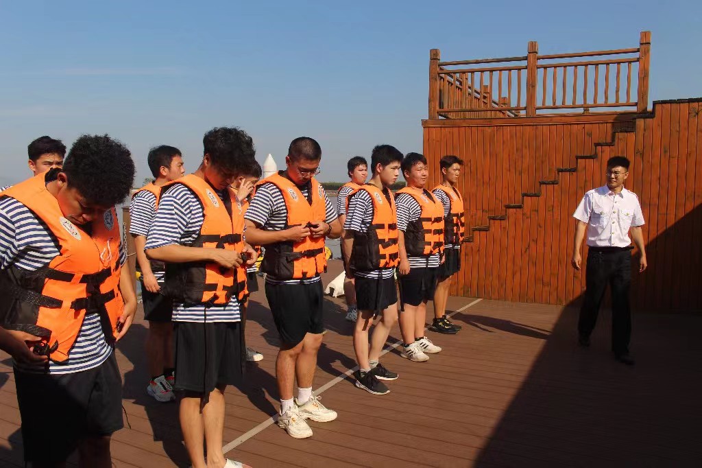 6月23日下午,学院组织同学们在揽月湖上举行了一场别开生面的操艇实训。学院特别邀请了有多年航海经验的张洪刚老师和有多年船员培训经验的朱鹏飞老师来为同学们讲解救生衣穿着、撇缆、打绳结等海员必备技能。参加实训的两组同学在专业教师的指导下,穿好就救生衣,迅速登船,展开了一场你追我逐的操艇接力。大家在揽月湖上努力控制着船舶前进方向,成功划到岸边,用刚刚学过的绳结系法将橡皮艇固定好,下船、集合一气呵成,在炎炎烈日下,同学们在学习技能的同时也体会到了海员的辛苦于不易。