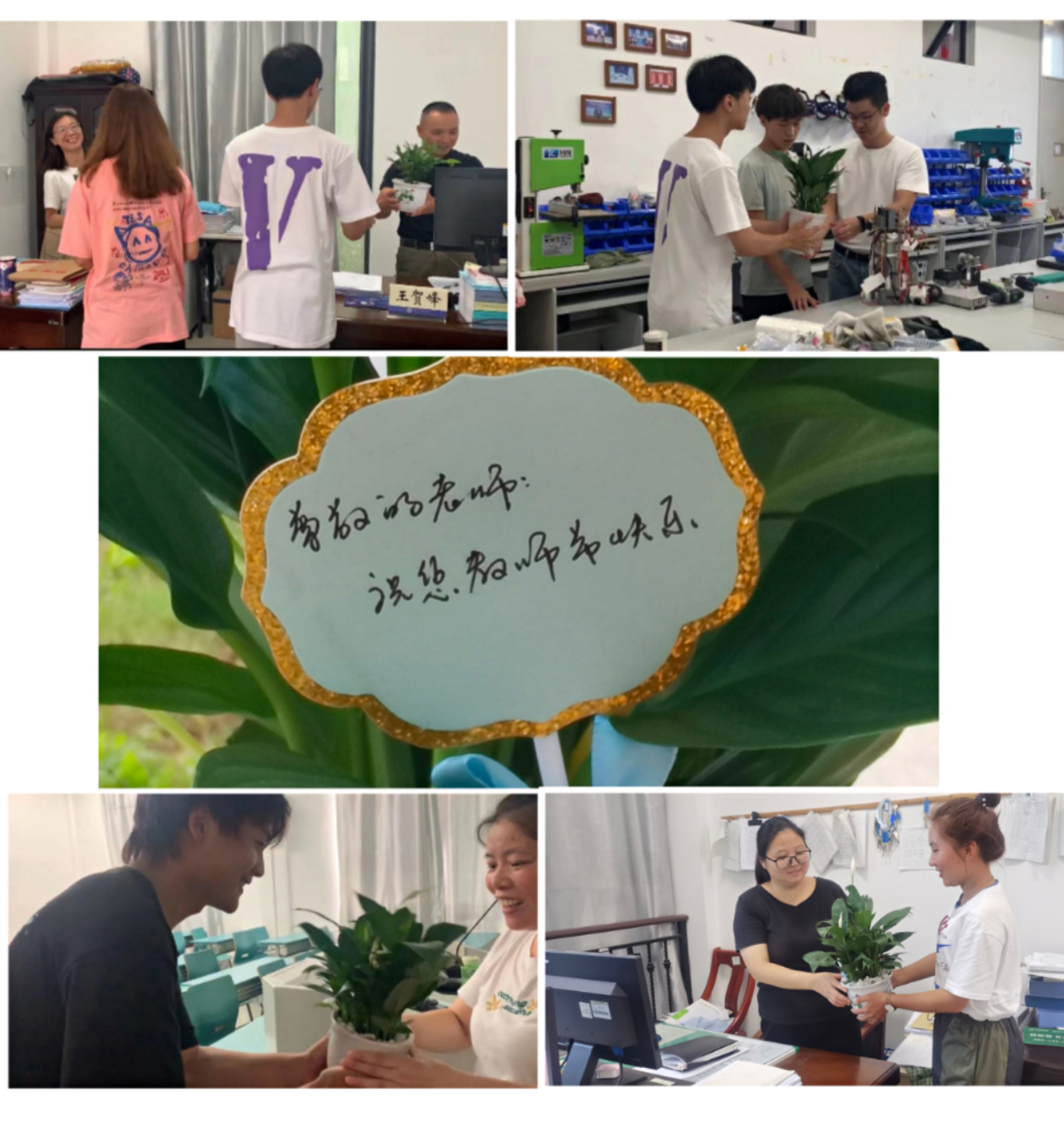 教师节当天,同学们带上亲自书写的祝福贺卡,为学院每一位教职工献上了一盆盆精心挑选的绿植以及最诚挚的祝福。许多老师表现出了惊喜与感动,对同学们的深情祝福表示感谢,纷纷表示同学们的成长成才就是对教师工作最好的认可。