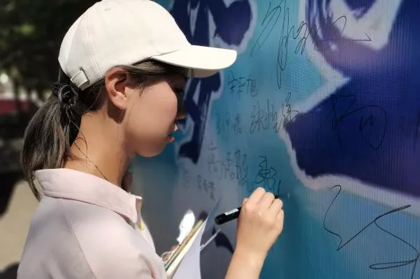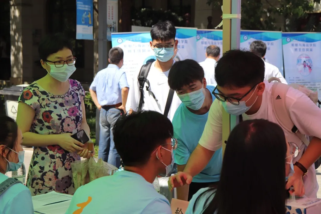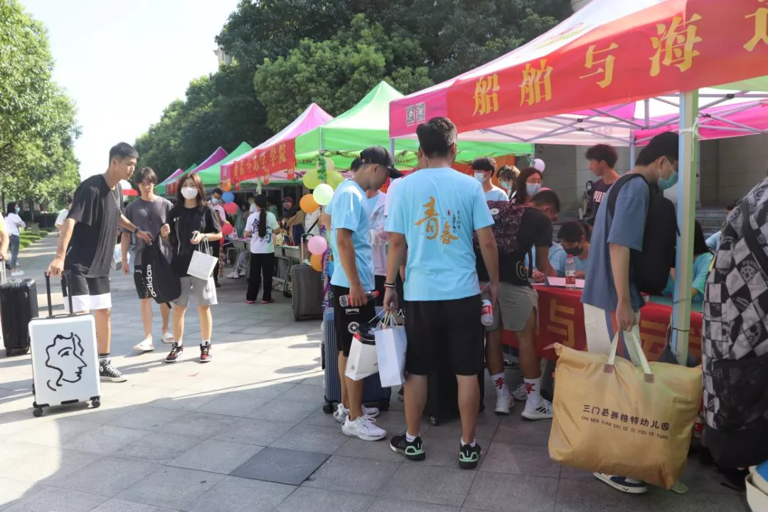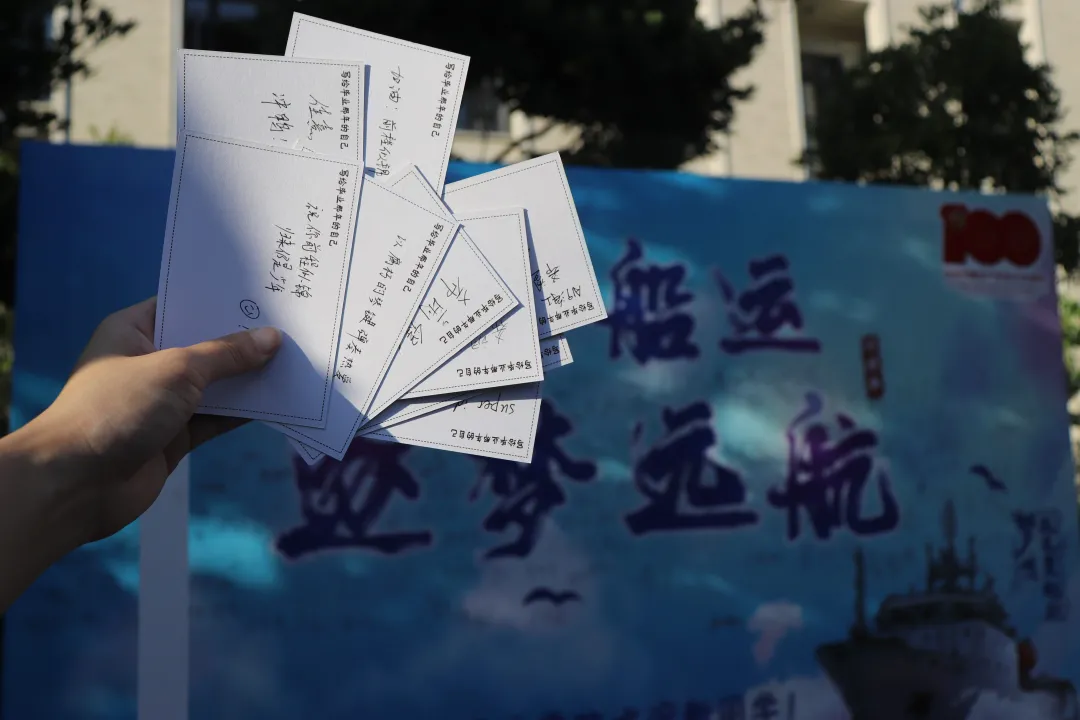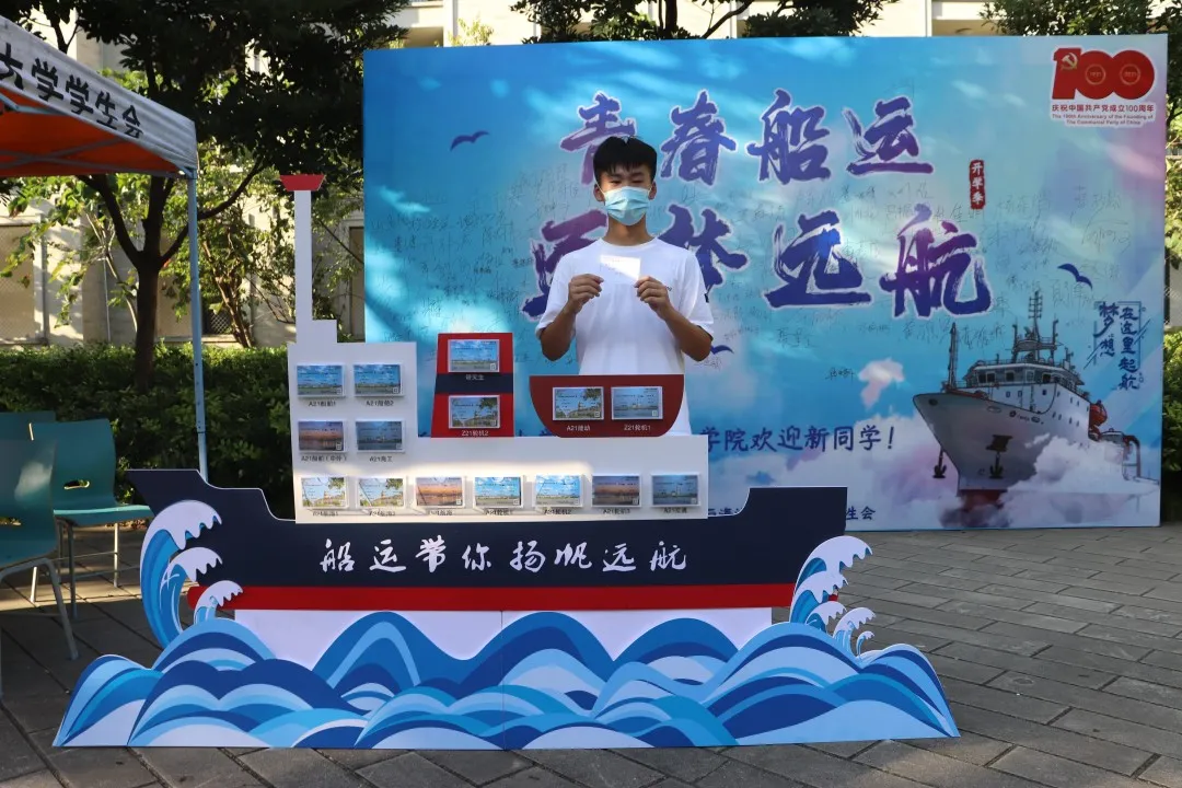 在J栋宿舍楼对面,船运学院设立了打卡活动点、签名墙,分发专属明信片,让新生以写信给四年后的自己的形式热烈欢迎新生们的到来,也祝愿新生未来的大学生活能如九月阳光耀眼,如乘风破浪顺利。青春船运,也将逐梦远航。