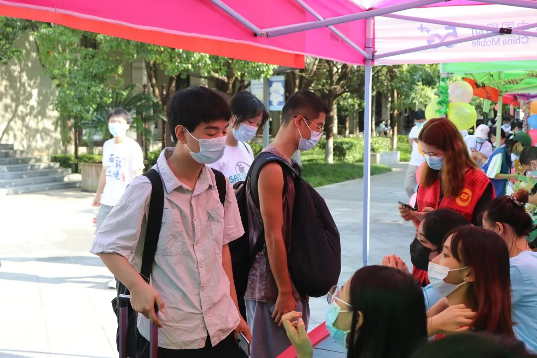 的各志愿者早早起床并于7:00在北一门集合。8:00起,2021级新生经排队、消杀、测温、扫健康通行证等程序,由各学院志愿者带领新生来到签到摊位。此时,伊莉讨论区