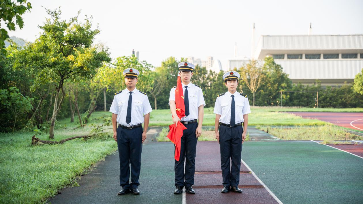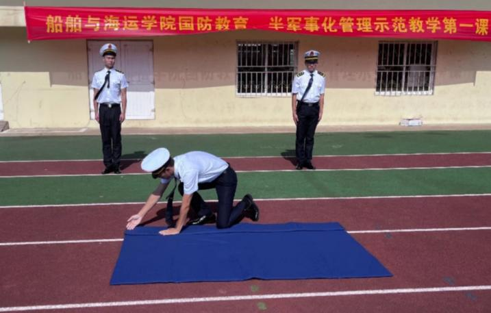 半军管是航海类专业学生管理的特色,为让2022级新生熟悉半军事化管理相关制度和要求,学院在定海校区田径场举行了一场别开生面的半军管示范教学。