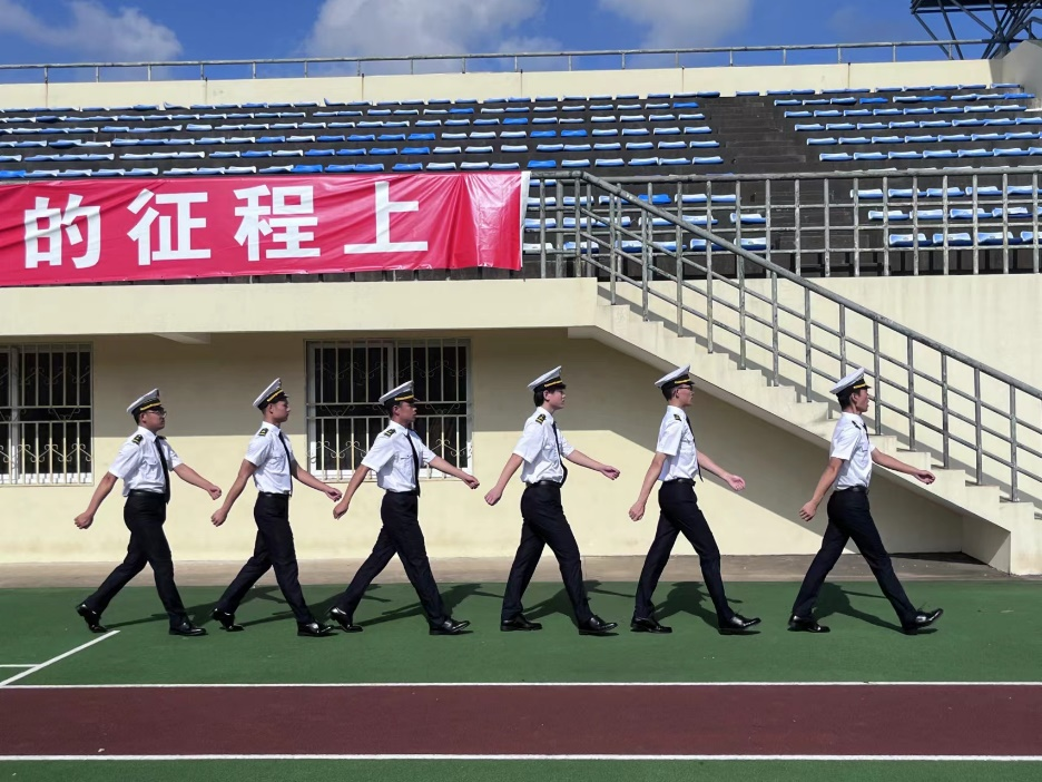 2022级航海类专业全体新生身着统一的海魂衫在操场列队集合。在庄严的升旗仪式后,在军事教官的指导下,高年级的学长们分别进行了队列展示、叠军被示范,充分展示了航海学子的飒爽英姿和积极向上的精神风貌。