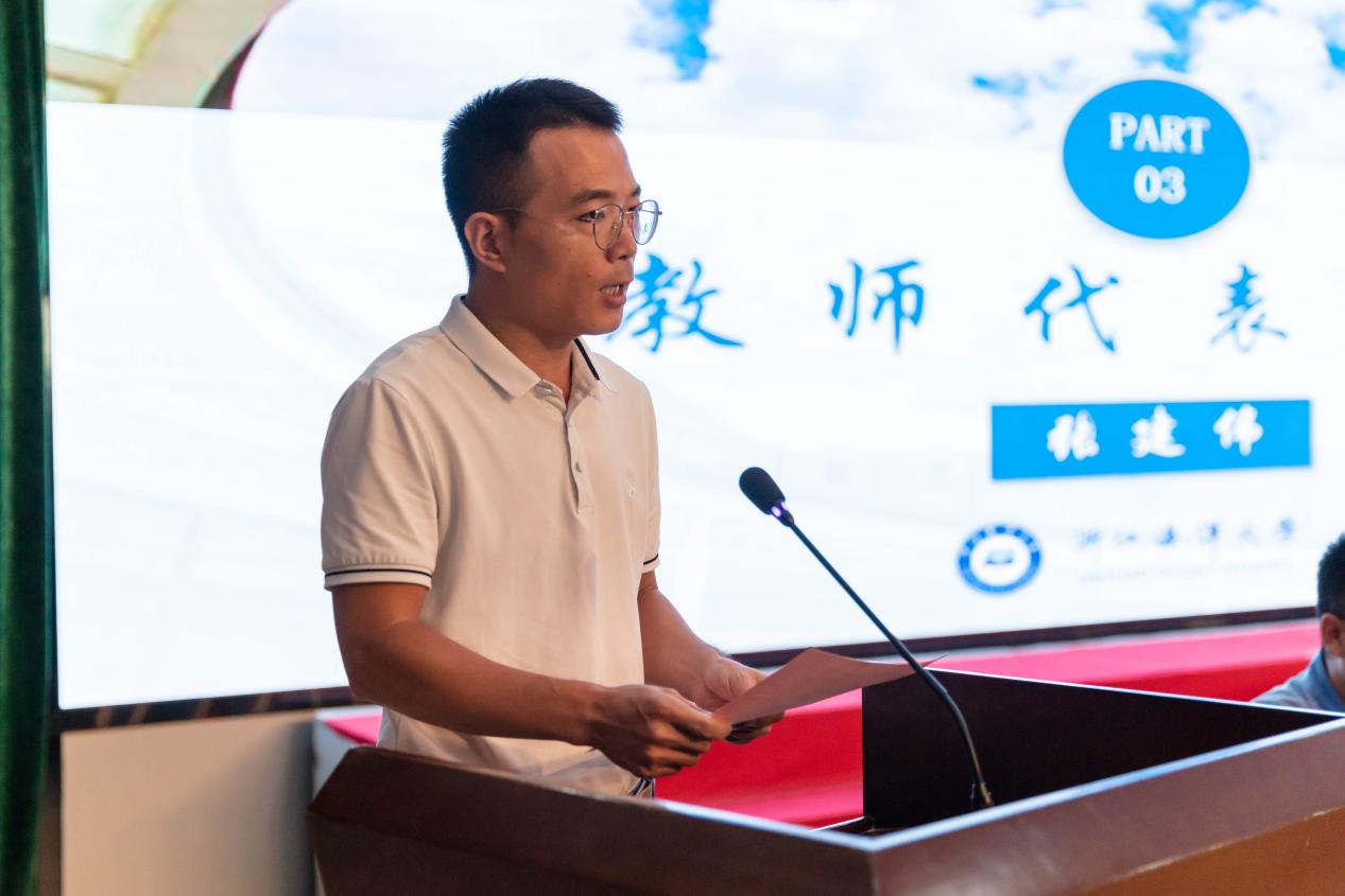 开学典礼上,老生代表、新生代表以及教师代表依次上台发言。老生代表A20轮机1班崔雨欣分享了自己的大学经历,强调了学会学习、学会坚持的重要性,与新生共勉:厚德博学创青春,自胜勤行谱华章。新生代表Y22交运仉欣慧以自身考研经历说起,以“海纳百川、自强不息”之精神,不怕困难,踏实学习;本科生新生A22能动宋诗涵在发言中讲述了作为一位大一新生自我控制力的重要性,⾃古圣贤之⾔学也,咸以躬⾏实践为先,识⻅⾔论次之,鼓励所有大一新生积极进取,不断实践,勇于创新。教师代表Z22轮机2班班主任张建伟博士以享受有质量的大学生活为题,从分享自身学习工作经历,鼓励新生明确目标、坚守本分,勉励同学们做到“五要”:要迅速完成角色转变;要自我评估,规划自我;要有纪律,一切行动听指挥;要强身健体,精神饱满地迎接每一天;要身体力行。