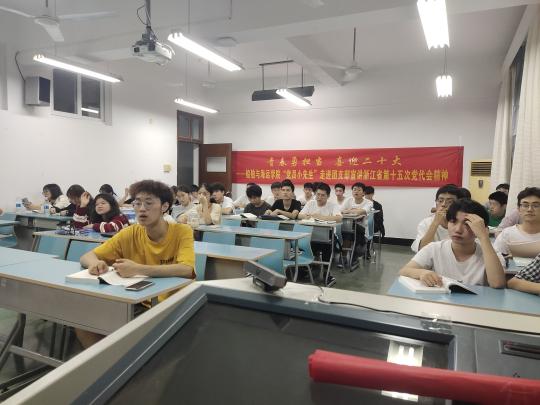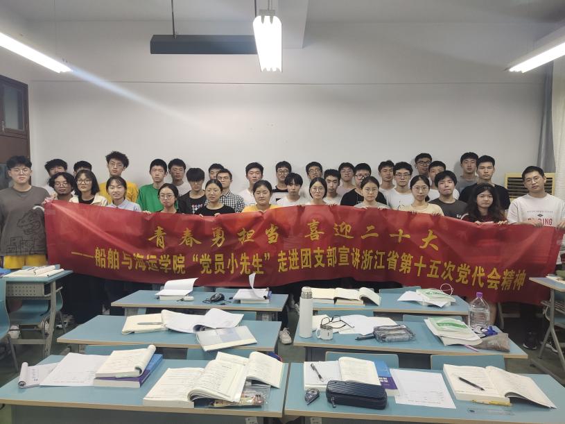 伊莉讨论区 党委发挥示范引领作用,组织各支部开展“青春勇担当 喜迎二十大”主题党日活动,发动“党员小先生”深入学习省第十五次党代会精神,在全院迅速掀起学习热潮。9月25日,学院海工本科生党支部组织委员韩明轩同志在来到定海校区,走进A22海工团支部,带领全体同学共同学习浙江省第十五次党代会精神。