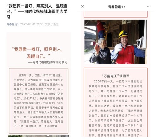 6月12日,学院公众号青春船运推送“我愿做一盏灯,照亮别人,温暖自己。”——向时代楷模钱海军同志学习的推文,号召大家向钱海军同志学习,学习他“我愿做一盏灯,照亮别人,温暖自己”的精神;学习他“服务百姓,就要做到百姓的心窝里去”;学习他把受助者真正放在了心上;号召当代青年要向钱海军同志学习,不负青春,不负时代,不负人民,努力在青春的赛道上跑出当代青年的最好成绩,为实现中华民族的伟大复兴而不断奋斗。