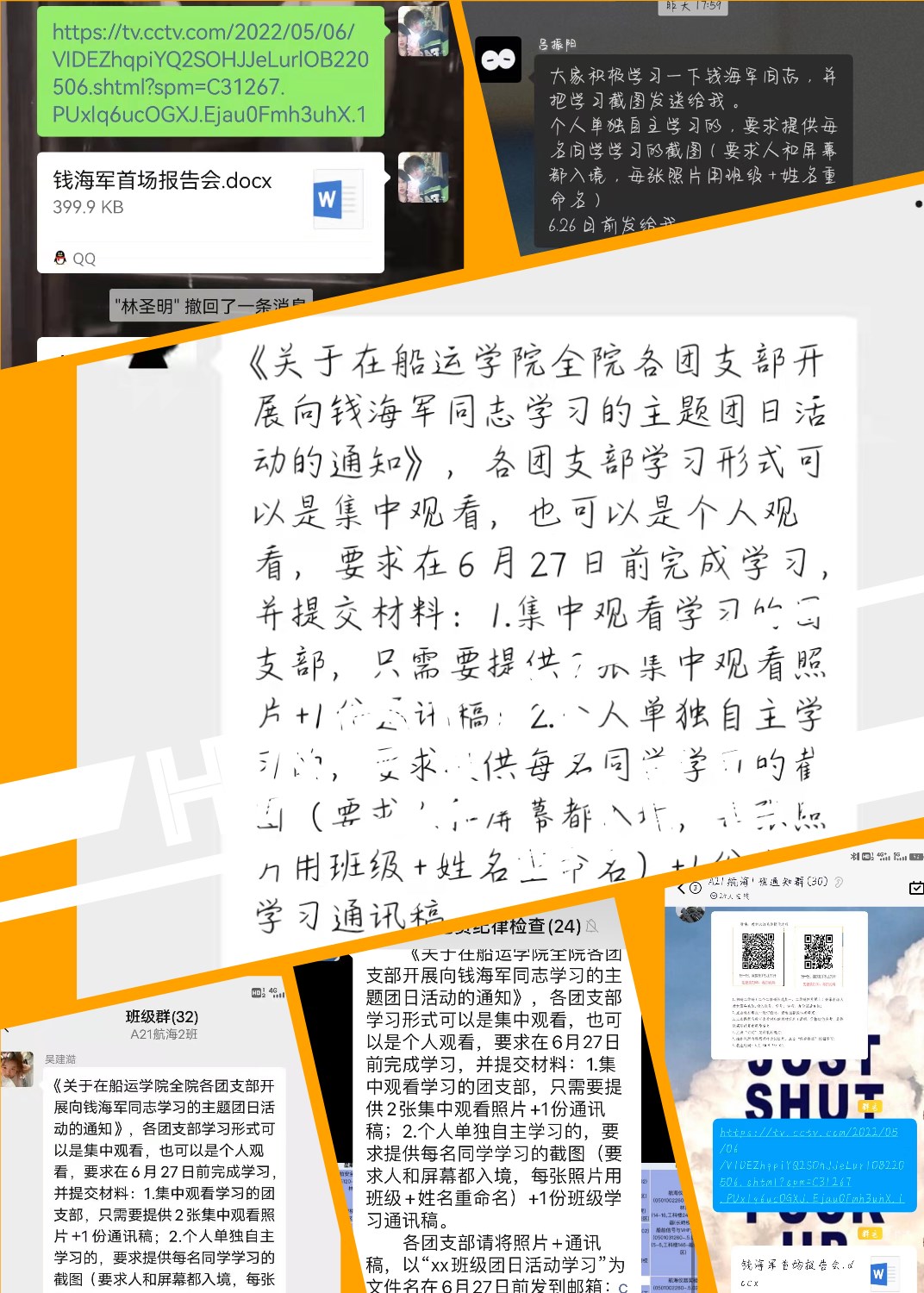 6月23日,学院团委组织团学干部集中学习了时代楷模钱海军同志的事迹,并进行了学习分享,他们表示一定会以钱海军同志为榜样,不辱使命,认真做好学生干部工作,全力为学院为同学做好服务。