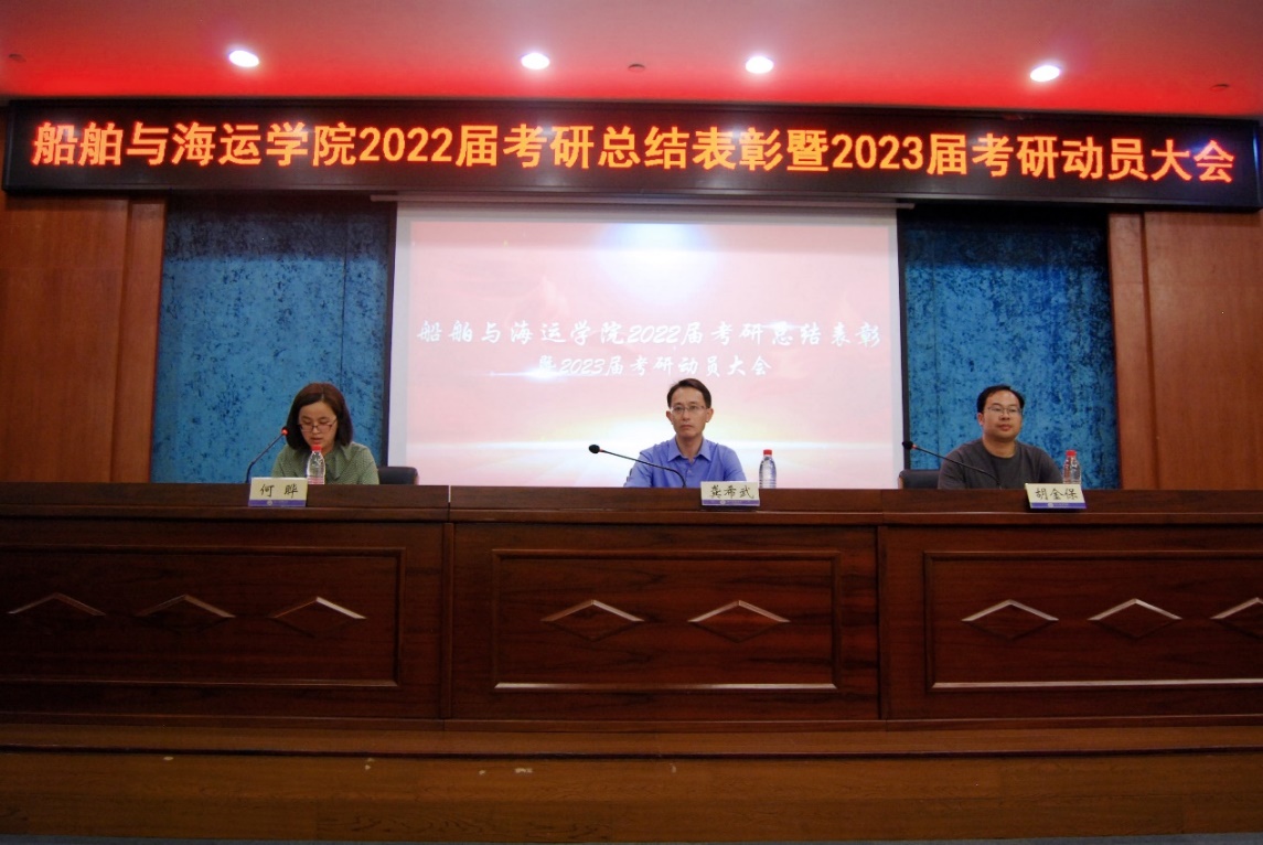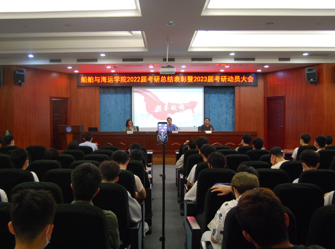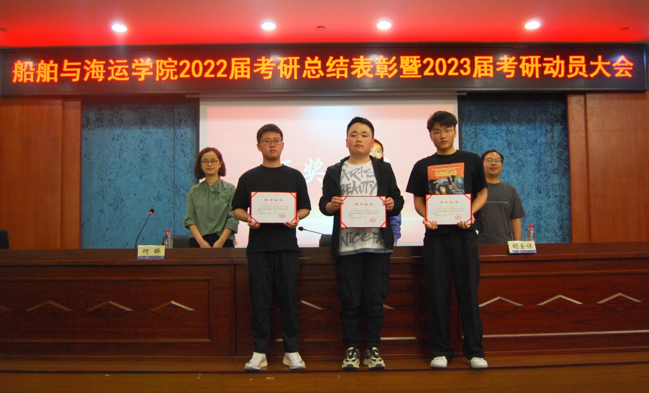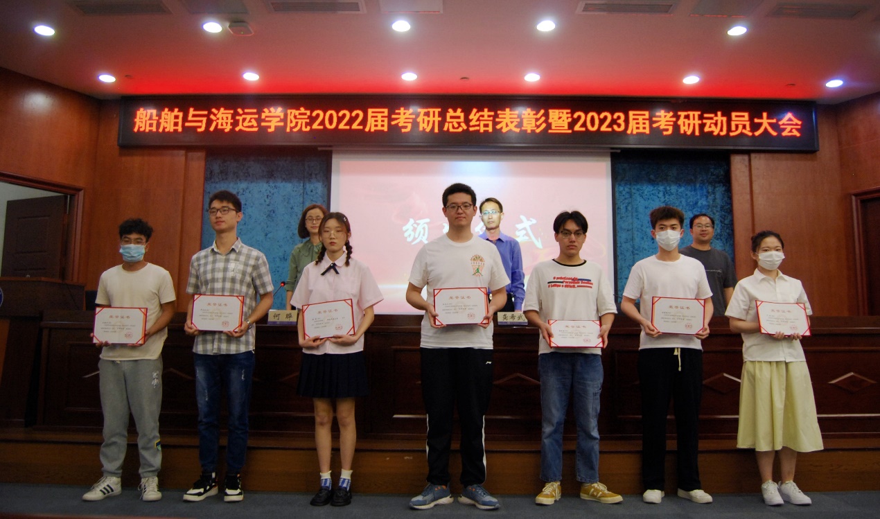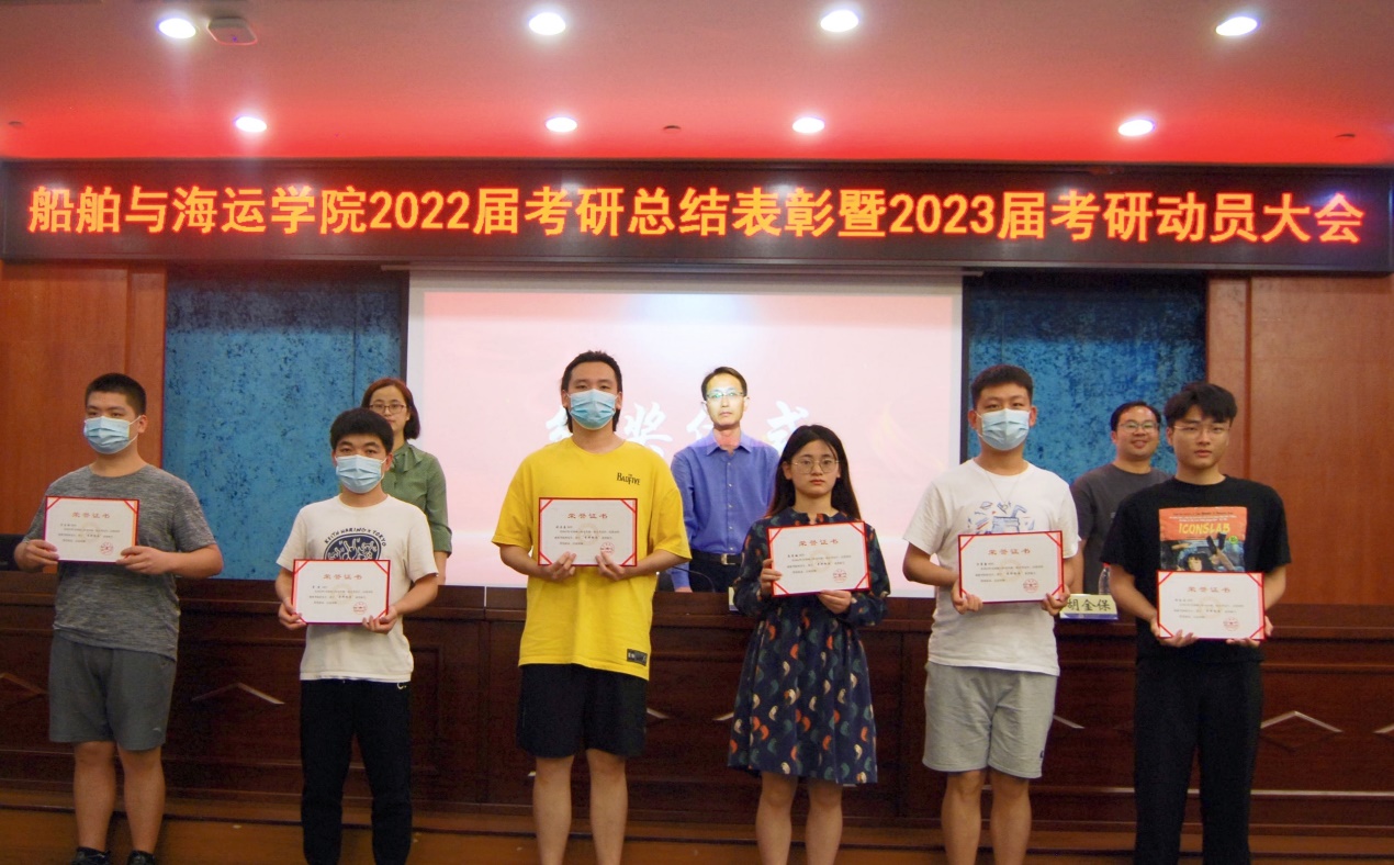 A18 船舶 2班许伟业、A18 海工班杜长江、A18 能动班韩佩霖、A18 交通班吴秀梅、A18 轮机 2班卢玮、A18 船舶 2班张端6位同学作为“考研标兵”代表上台发言,Z20 轮机 2班刘祉禾同学作为“考研优秀寝室”代表发言。他们表达了对学校、老师的感激之情,同时根据自身考研、出国申请经验,向2023届学弟学妹们提出了数条行之有效的建议,如保持乐观心态、自主安排学习进度、及时复习回顾、坚持不懈不轻言放弃等,祝愿他们能成功上岸,实现自己的梦想。