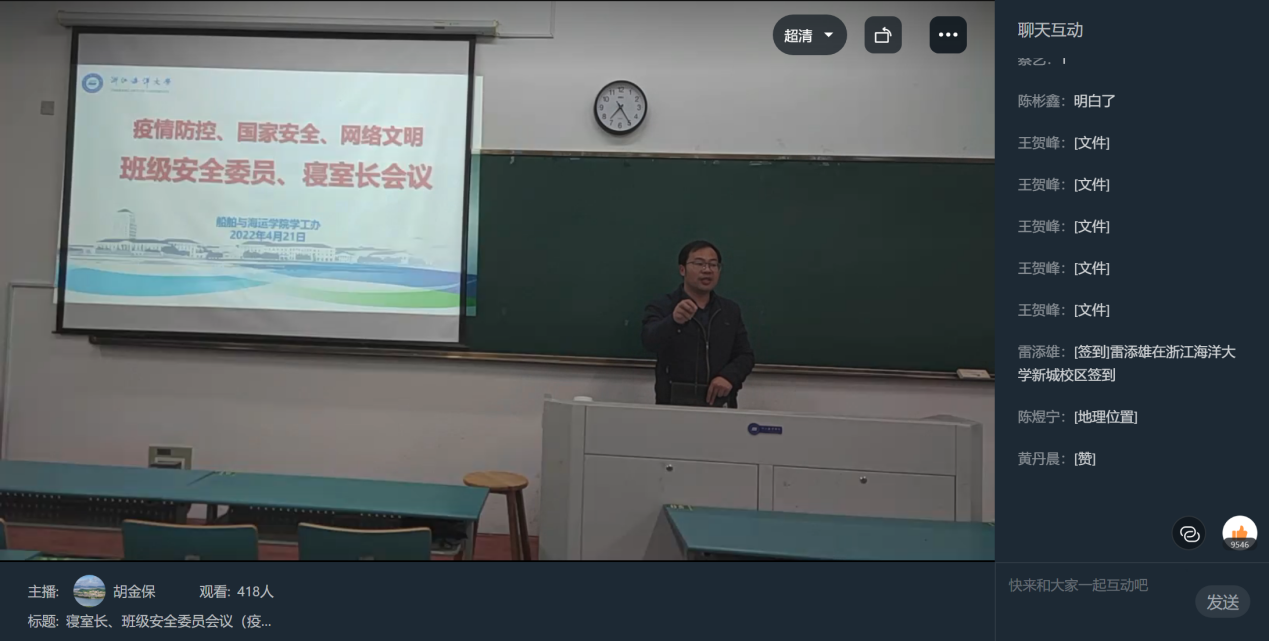 胡金保带领全体班级安全委员、寝室长一起学习了学校疫情防控相关政策以及疫情防控指南,进一步强调了疫情防控常态化下学生日常管理的有关要求,通报了近期发生的学生因违反学校疫情防控规定而受到纪律处分的案例。介绍了学院寝室夜查四级网格报告制度,即寝室长——班级安全委员——年级联络员——辅导员,要求班级安全委员、寝室长务必认真对待。