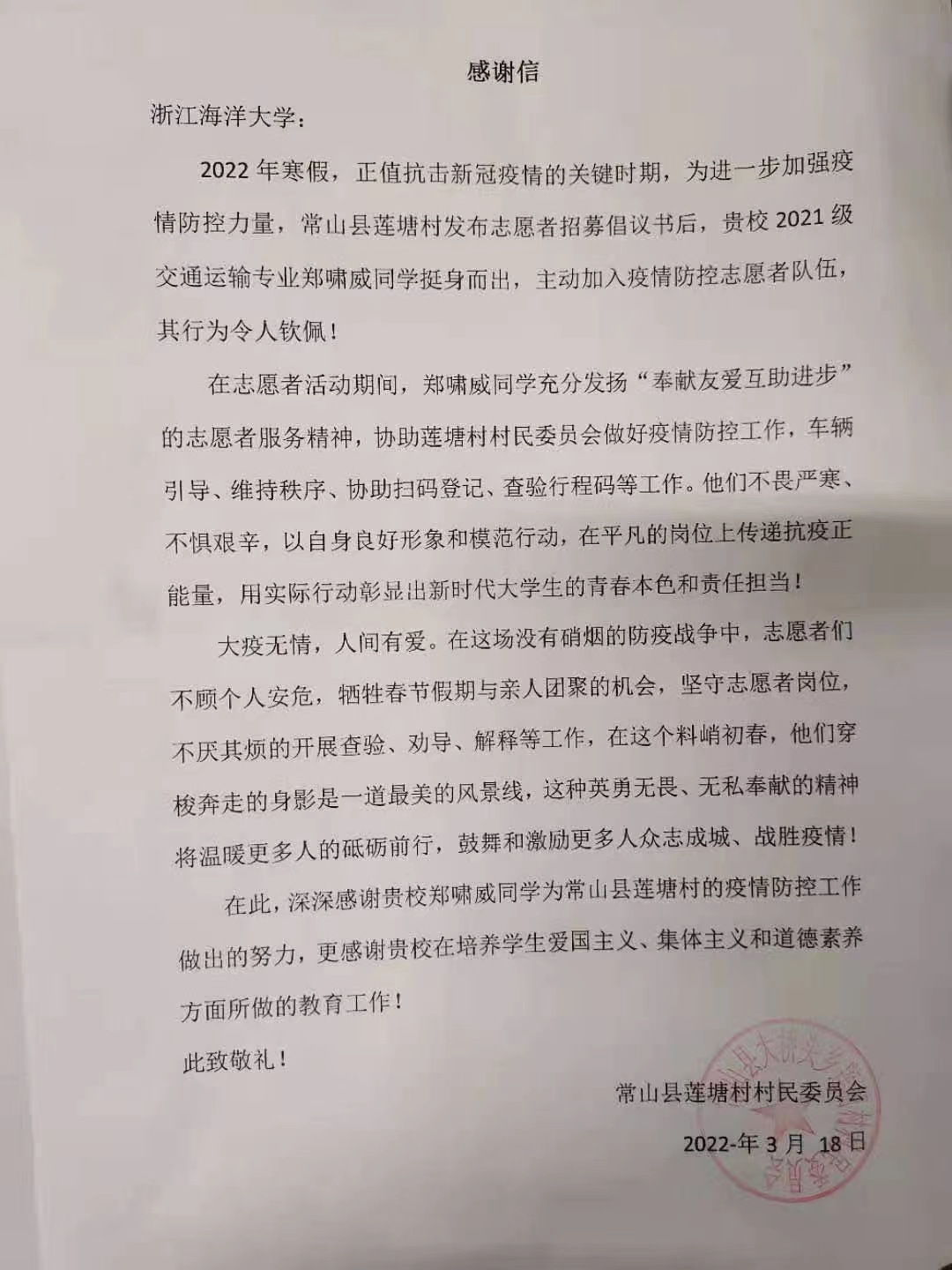 4月13日,我院收到了一份从常山县莲塘村寄来的感谢信和最美志愿者证书,我院21级研究生郑啸威同学的优秀事迹才被我们所知晓。