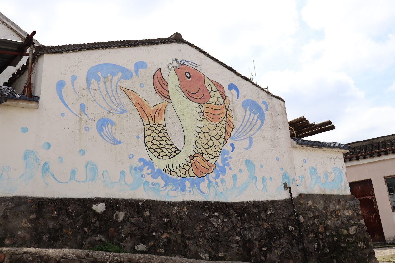 船运学院师生走进村落,映入眼帘的是南洞艺谷内的徽派建筑群,这是目前舟山徽派建筑数量最多,风貌体现最完整的地方。整个村庄二百多套居民外墙由一幅幅巨大的彩绘图组成。壁画呈现了新时代村民生活场景,主题涵盖了海洋文化和各时期文艺代表作品,漫步其中就像走进了充满浓郁氛围的艺术天地。南洞艺谷火车广场,停靠着一辆“功勋号”列车。它是在上世纪30年代建造的特种列车,是运送“两弹一星”科学家从华东地区到大西北开展科学研究的专列。在当地导游的介绍下,大家了解了该辆列车所承载的“两弹一星”精神背后的红色故事,深切感受到当地的红色人文底蕴。