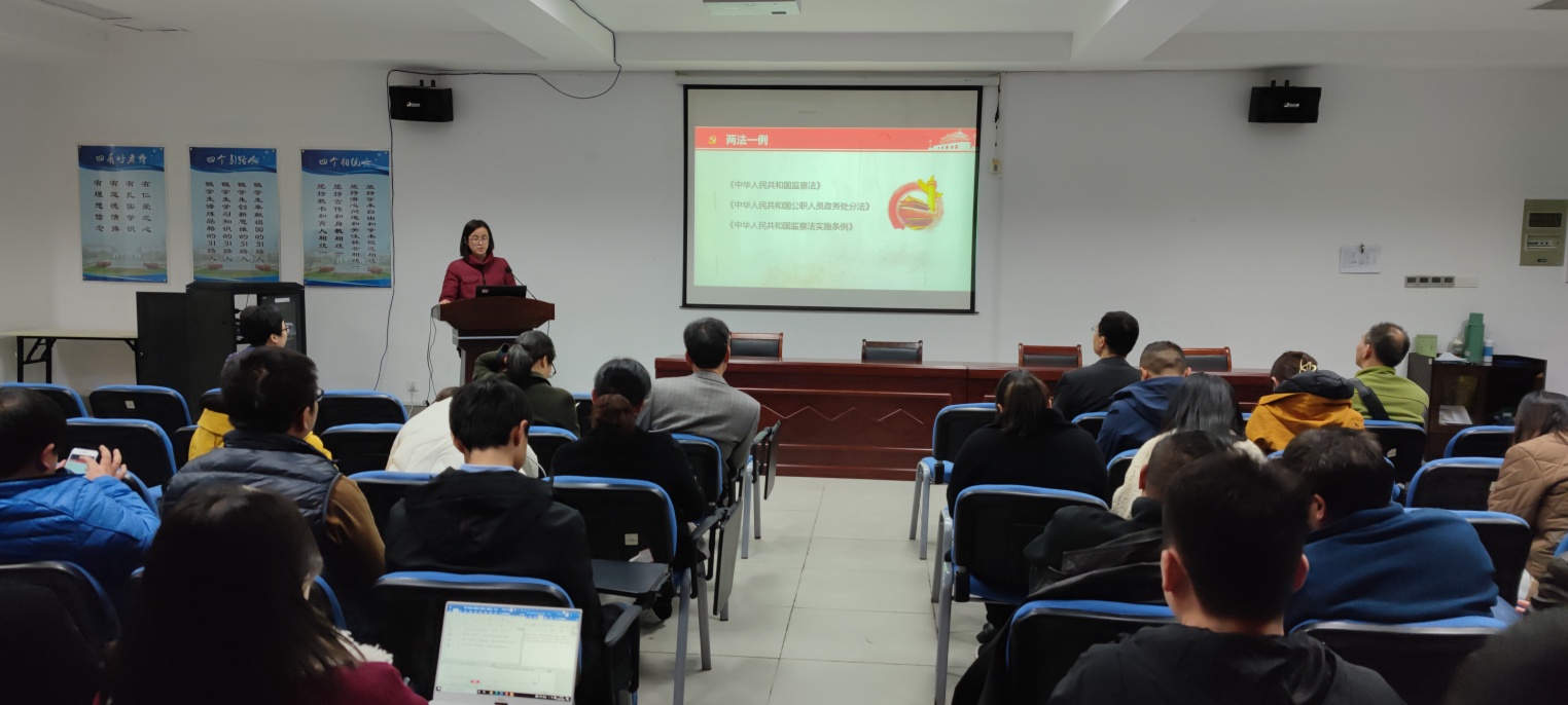 12月16日下午,学院召开全院教职工大会,面向全体教工进行了“两法一例”专题学习,党委副书记、纪委书记何晔对照《中华人民共和国公职人员政务处分法》具体条款,重点围绕公职人员违法行为及其适用的处分,结合学院实际情况,将高校教师日常工作和生活中容易出现的问题进行了解读和强调。党委书记潘爱珍强调,大家要切实提高思想认识,认真学习领会“两法一例”的主要内容,把握其精神实质,提高法纪意识,自觉用法律法规来约束规范自己的行为,切实做到守住底线、不越红线、不碰高压线。