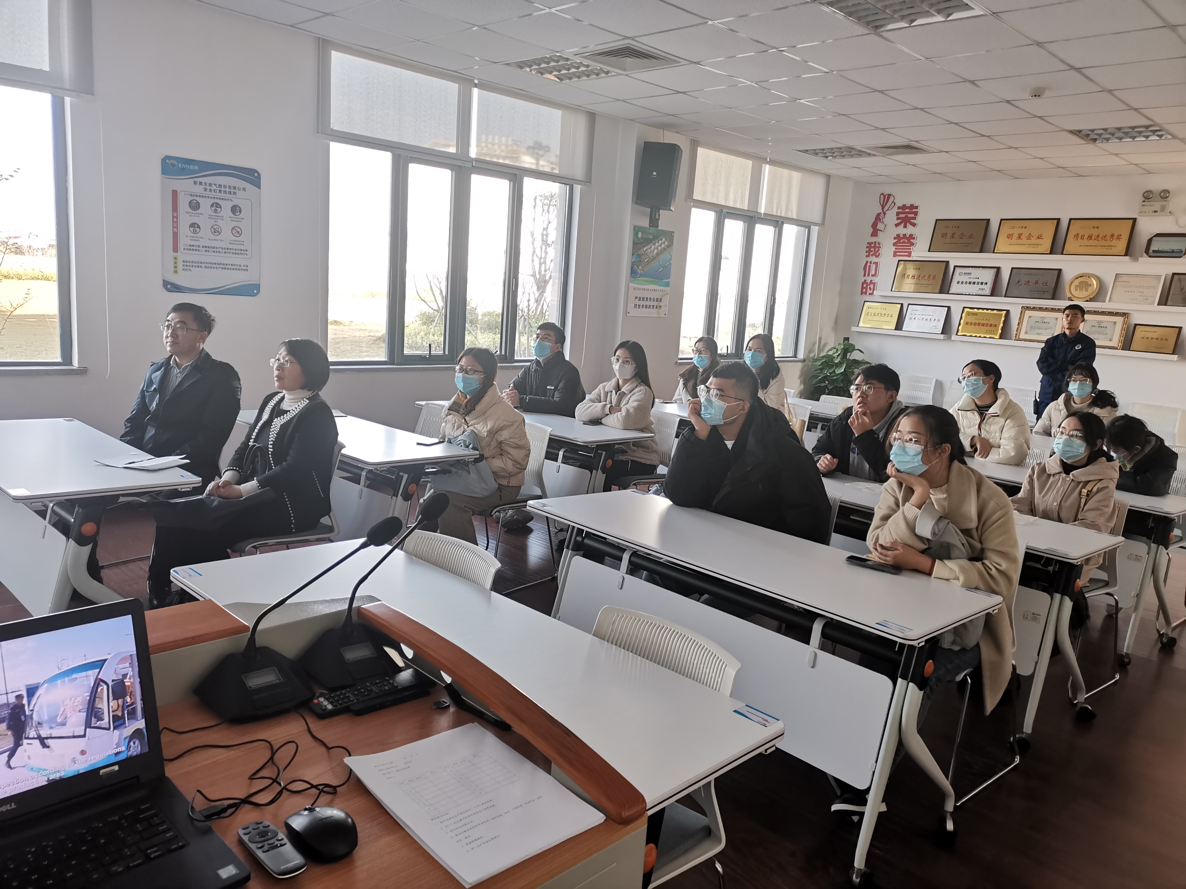 在郭经理的介绍下,同学们了解到舟山新奥LNG接收及加注站位于中国沿海经济最发达地区之一的核心位置,紧靠长江口,LNG供应可直接覆盖整个华东地区和长江沿线各大省市,是国内运行的22座LNG接收站之一,也是国内首家民营企业投资的规模最大且唯一的一座一级大型LNG接收站。