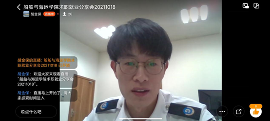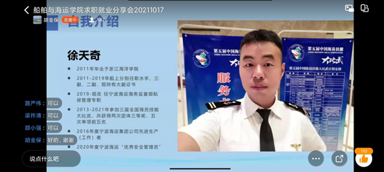 在钉钉上举行校友求职就业经验经验分享会,2011届航海技术专业毕业生徐天奇,2020届海洋工程与技术专业毕业生潘晓峰,2021届航海技术专业毕业生曹博文、轮机工程(轮机管理方向)王稳、船舶与海洋工程专业毕业生刘云龙、能源与动力工程专业毕业生王澍淳等6位校友从求职面试、就业经验等方面做分享。