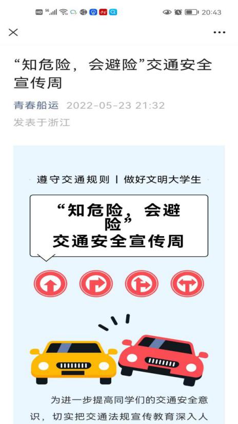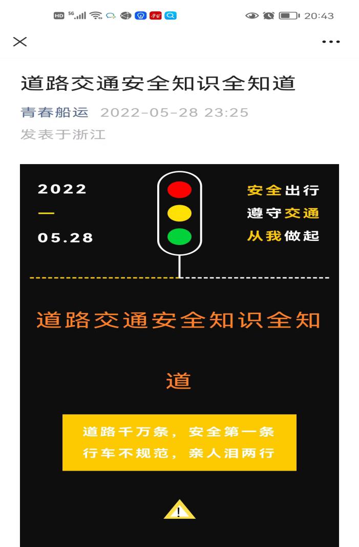微信公众号《青春船运》本周推出三期关于交通安全教育文章,并通过微信、QQ群等平台进行转发,让学院每位师生参与到交通安全教育中,成为交通安全的参与者、践行者。