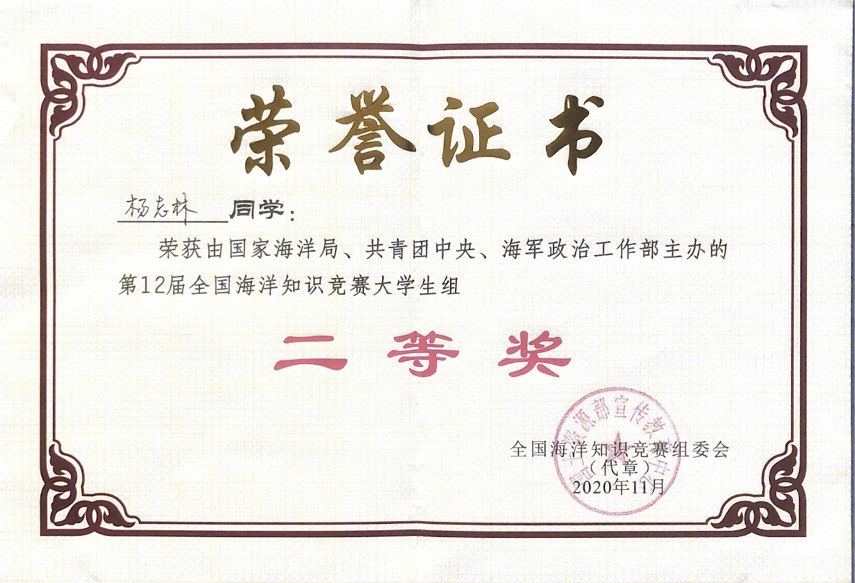 全国大学生海洋知识竞赛自2008年创办以来,至今已成功举办十二届。作为海洋知识爱好者的盛会,本次大赛经过前期网络个人参赛、学校推荐、地区选拔、海军院校选拔四种方式,杨志林同学与来自上海交通大学、厦门大学、中国海洋大学,四川大学等40多所高校的60名选手成功晋级全国总决赛。通过“一锤定音”、“不可多得”、“一站到底”、等多个环节,杨志林同学展现出了丰富的海洋知识储备和现场表现能力。