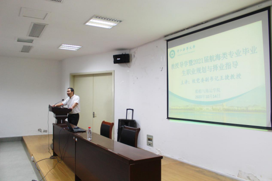 在工科119报告厅顺利举行教授导学活动,邀请校党委副书记王捷教授为学院2021届航海类专业毕业生作职业规划与择业指导讲座,讲座由学院党委书记、副院长潘爱珍主持。