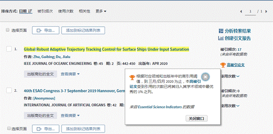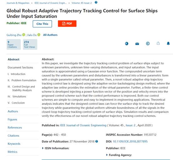 近日,我院教师祝贵兵博士发表于国际海洋工程领域知名期刊《IEEE Journal of Oceanic Engineering》上的研究论文“Global robust adaptive trajectory tracking control for surface ships under input saturation”被归入该学术领域中最优秀的1%之列(ESI 1%高被引),Web of Science库的引用次17次。该论文发表于2020年4月份,论文通讯作者为其博士生导师。