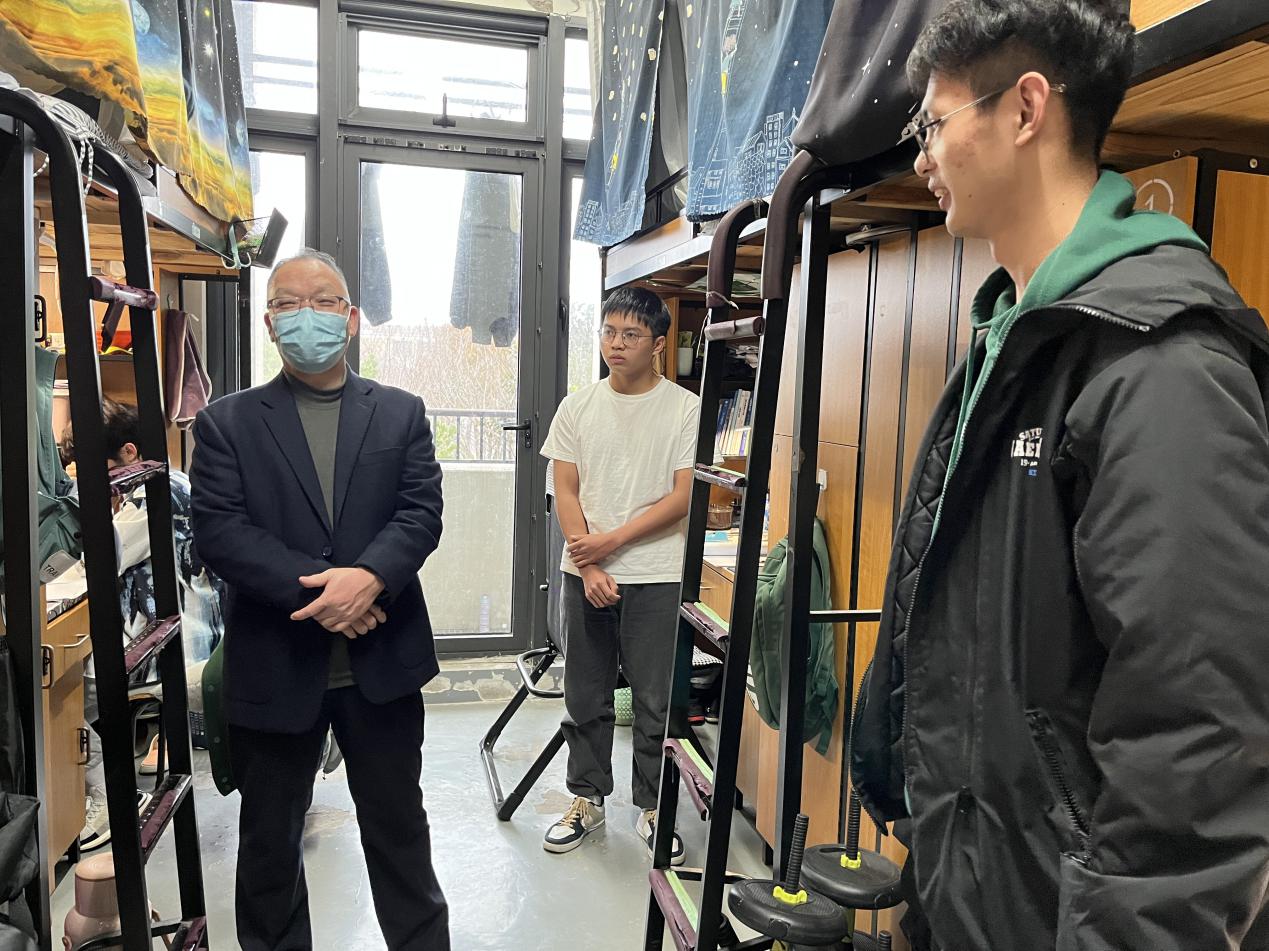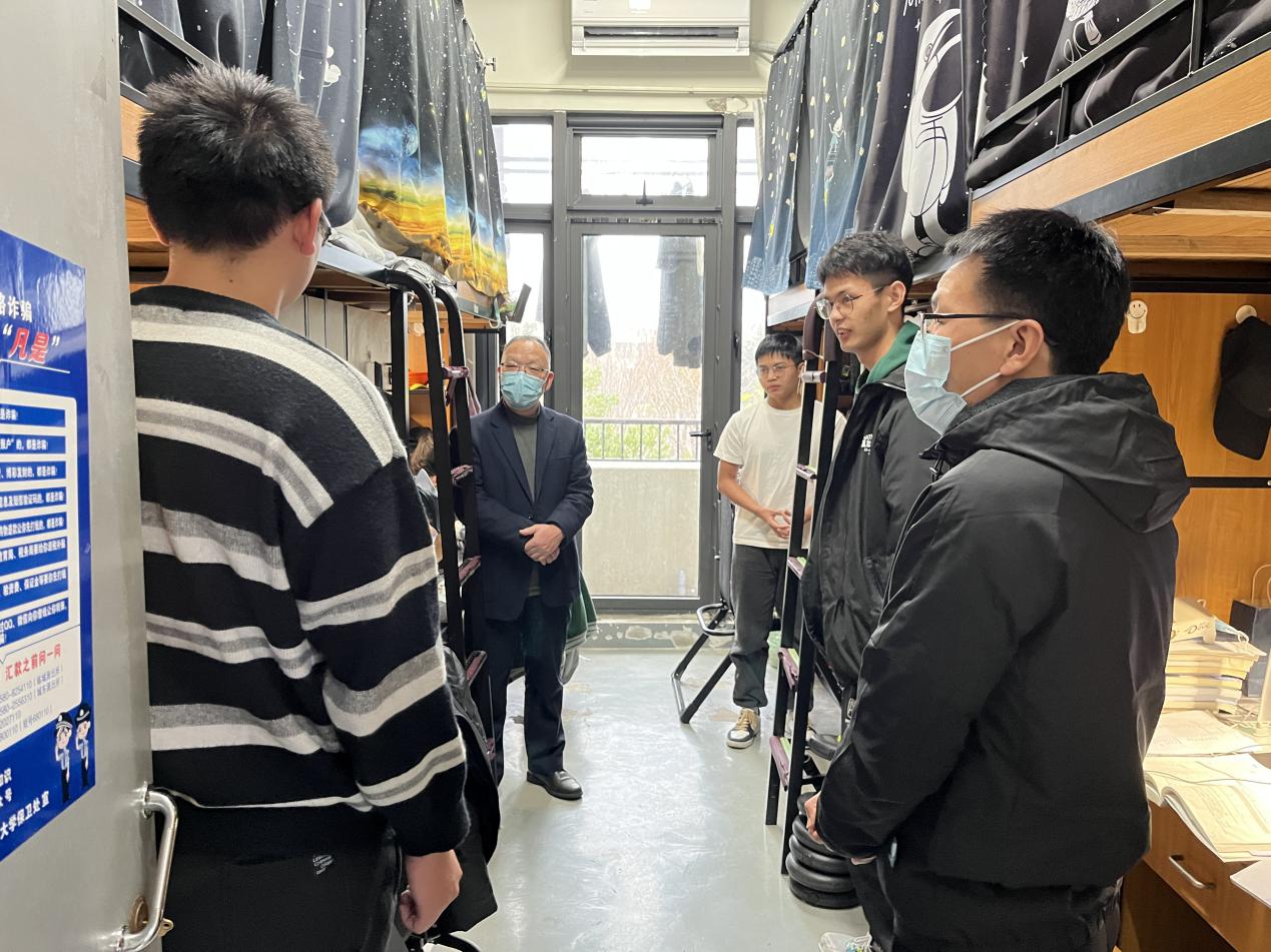 在K幢114,谢永和与同学们亲切交流,关心了解学生的学习、生活情况、思想动态及就业情况,认真倾听学生在校学习生活中的困难及诉求,仔细叮嘱学生要注意防寒保暖,并鼓励同学们要养成良好的学习生活习惯,勉励同学们要志存高远、脚踏实地,合理规划学业,认真学习专业知识,理论联系实际,在伊莉讨论区