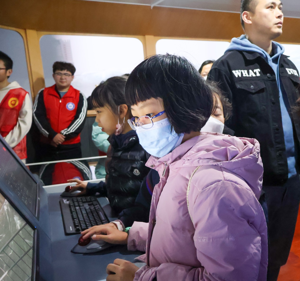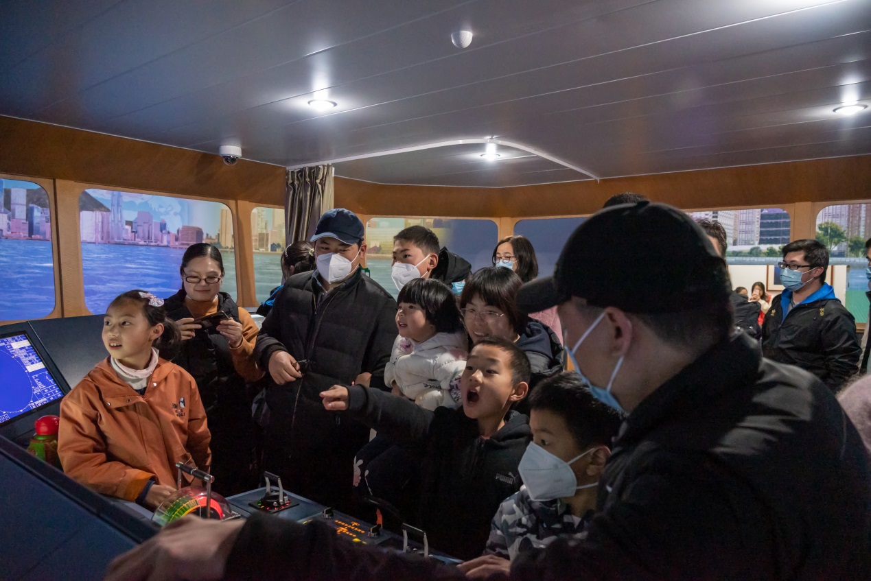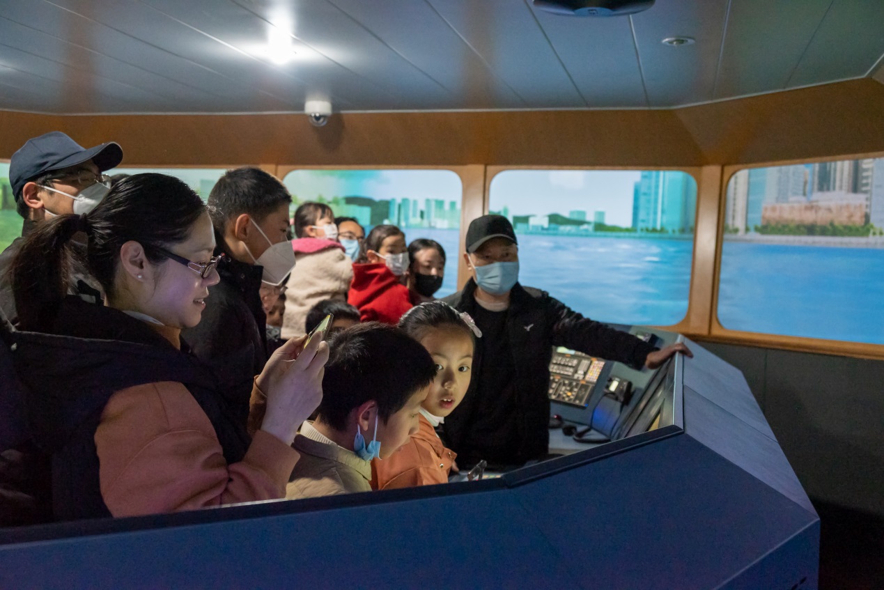 志愿者们带着小朋友步入大型船舶操纵模拟器实验室,广阔的海洋在屏幕上尽收眼底,各种仪器揭开神秘的蔚蓝之谜,小朋友们在各种仪器屏幕前驻足。在刘虎、梁民仓老师的指导以及志愿者们的陪同下,小朋友们握紧操纵杆,身临其境地驾驶船舶,一个个争先恐后地当起小船长。船帆扬起,乘风破浪!