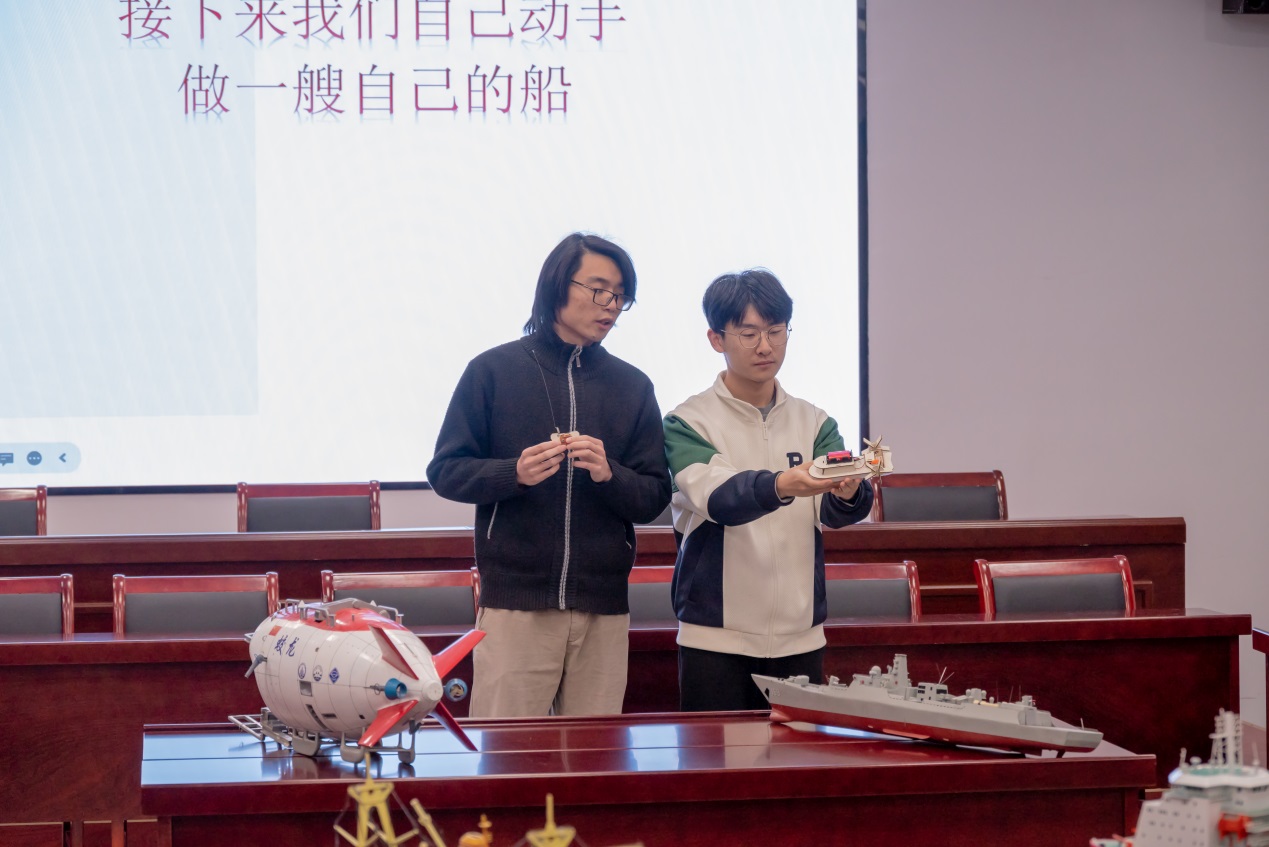 在志愿者们的带领下,小朋友集合于工科楼120报告厅,海天一社社长王云浩、驰风模型社社长鲁程绘声绘色地向小朋友们讲解海洋科学知识。听完航海趣事,小朋友们在惊喜之中接过船模组件。在爸爸妈妈的帮助和志愿者耐心的指导下,小朋友们有序地完成船模拼装,现场一个接一个骄傲地秀起成果,“大哥哥,快看我的小船拼好啦!”,报告厅充满欢声笑语。
