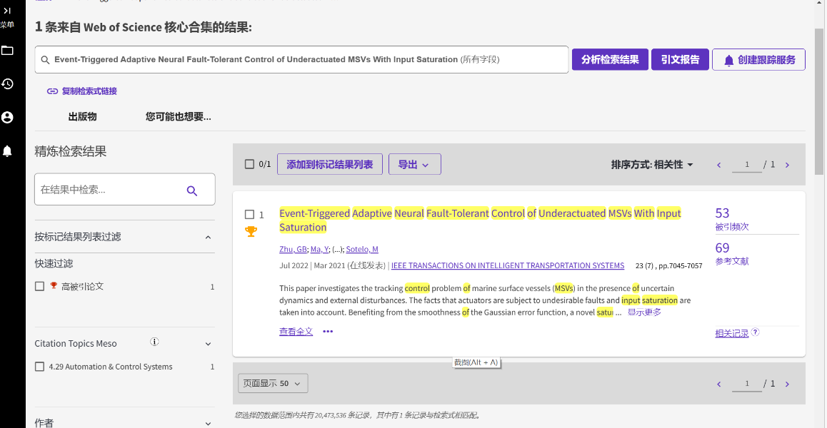 近日,我院教师祝贵兵博士发表于国际智能交通领域知名期刊《IEEE Transactions on Intelligent Transportation Systems》上的研究论文“Event-triggered adaptive neural fault-tolerant control of underactuated MSVs with input saturation”被归入该学术领域中最优秀的1%之列(ESI 1%高被引),Web of Science库的引用次53次。该论文发表于2022年7月份,我校为第一作者单位。
