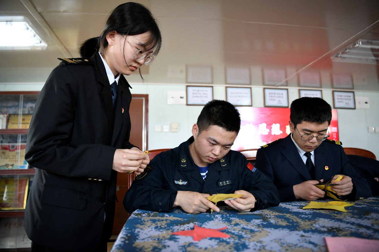 活动结束之际,全体同学与官兵们体验海洋剪纸,表达了对祖国最真挚的情感。