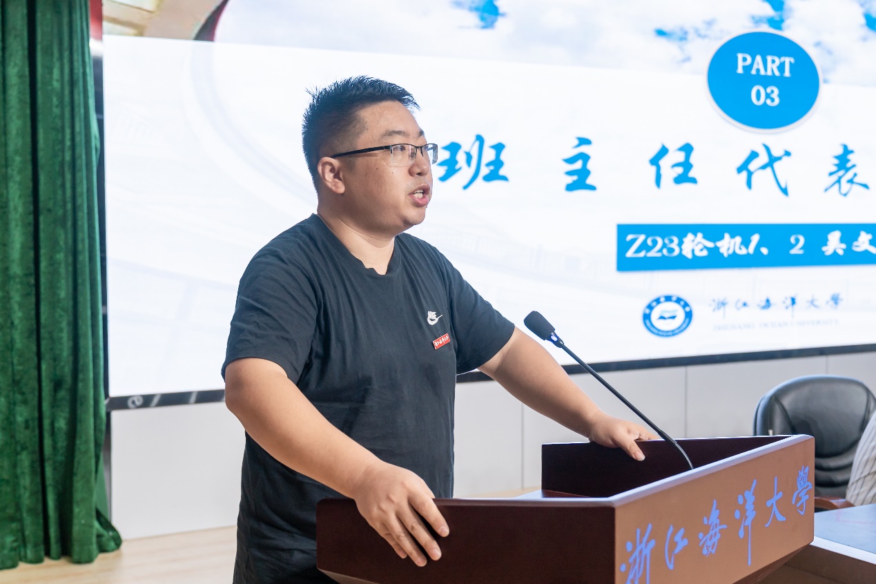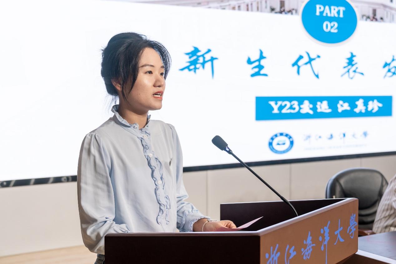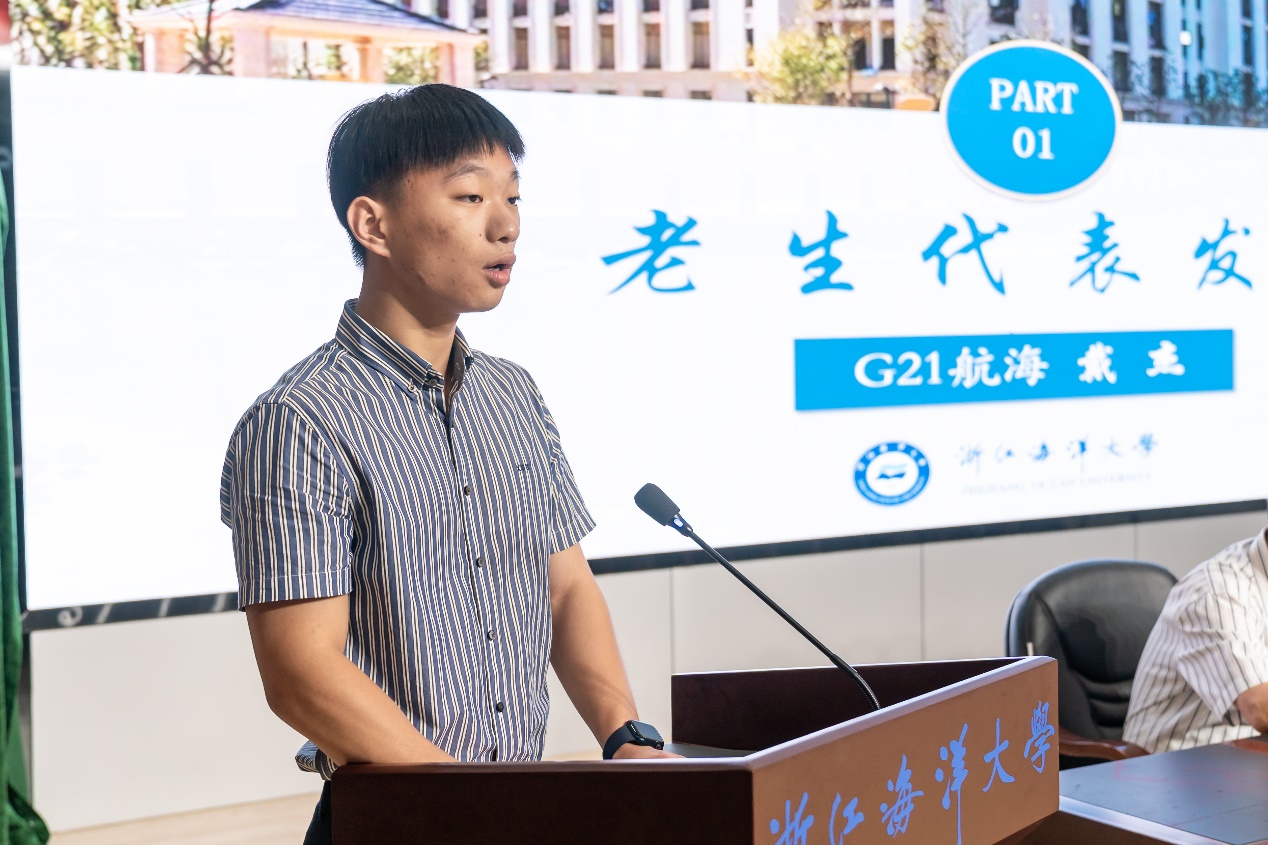 开学典礼上,老生代表、新生代表以及教师代表依次上台发言。学院学生会主席、G21 航海班戴杰同学作为老生代表发言,分享了自己在校期间的学习心得和经验体会,希望学弟学妹们珍惜在校时光,努力拼搏向上,多做有意义的事,不断实现人生价值。新生代表A23海工班李铭、Y23交运1班江真珍表示作为新的“海大人”“船运人”将会通过不懈努力,成为更好的自己,走向最美的人生。教师代表Z23轮机1、2班班主任吴文锋分享了他对大学规划的思考和对新生的几点建议。他希望同学们能坚定的站在自己的人生舞台上,拒绝随波逐流任命运主宰,朝着自己的目标方向积极努力,成长为自己心目中想成为的那个人,不断去追寻自己的梦想。