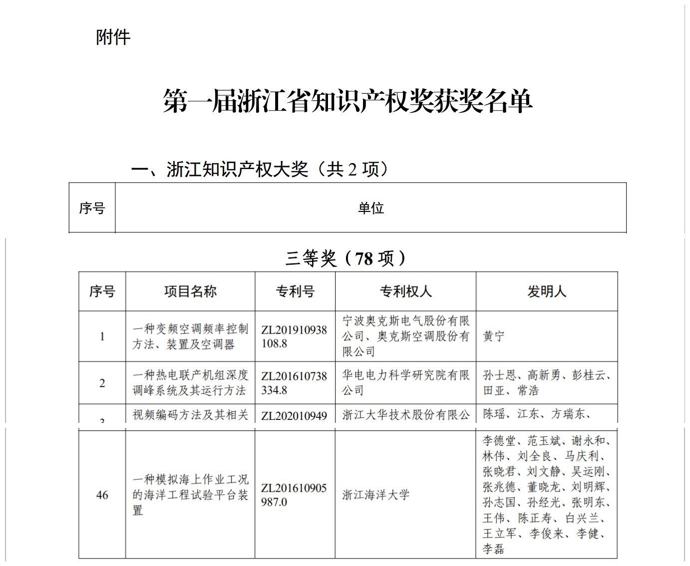 近日,浙江省市场监督管理局公布了第一届浙江省知识产权奖获奖名单,我院李德堂教授的《一种模拟海上作业工况的海洋工程试验平台装置》荣获第一届浙江省知识产权奖发明专利三等奖。