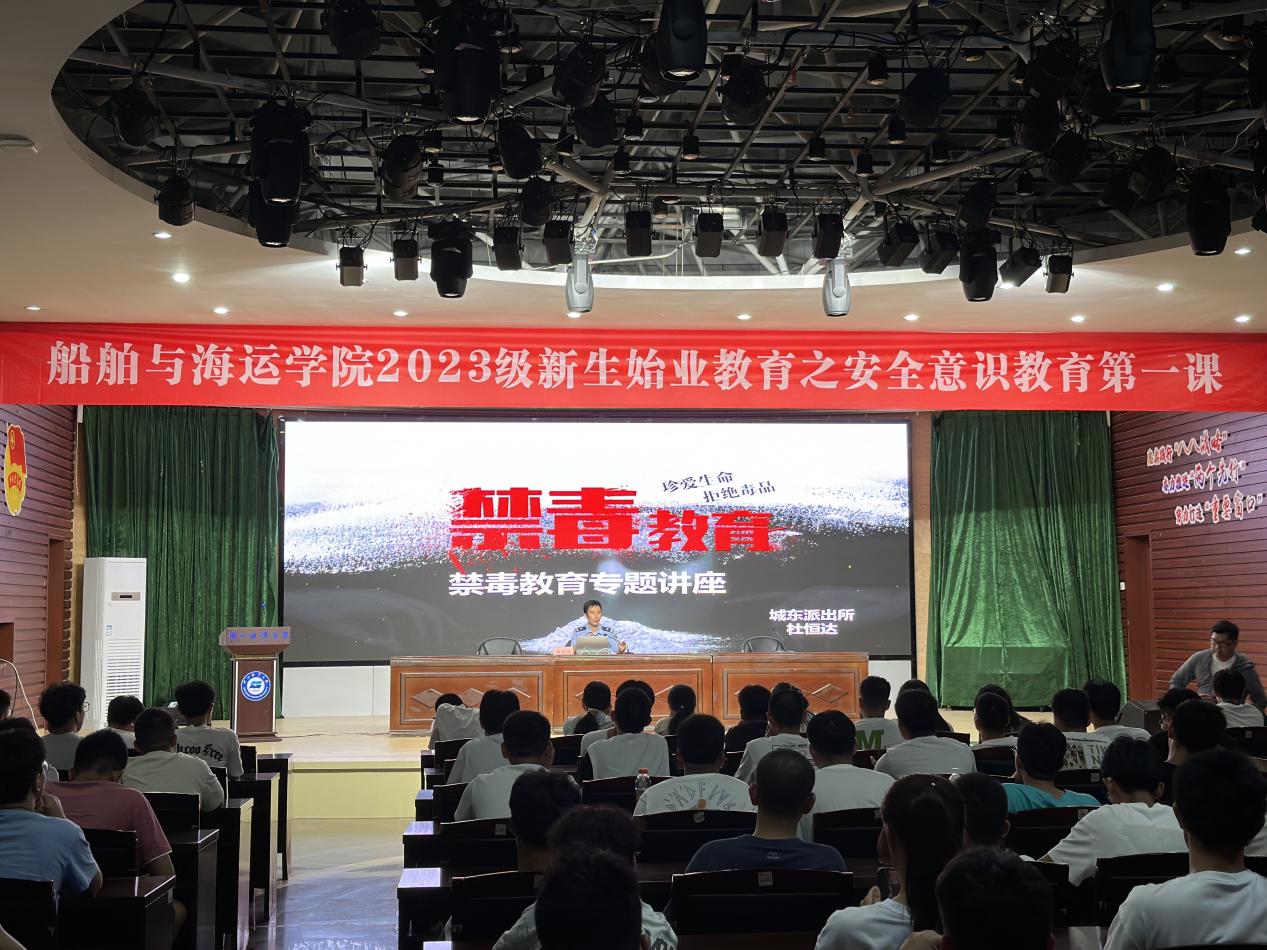 于定海校区活动中心,为2023级新同学开展始业教育之安全意识教育第一课,本次教育活动邀请到定海城东派出所民警杜恒达警官开展了以法制宣传为主题的教育讲座,军事教官王贺峰老师为大家带来安全管理教育讲座,2023级423名同学参加了本次讲座。