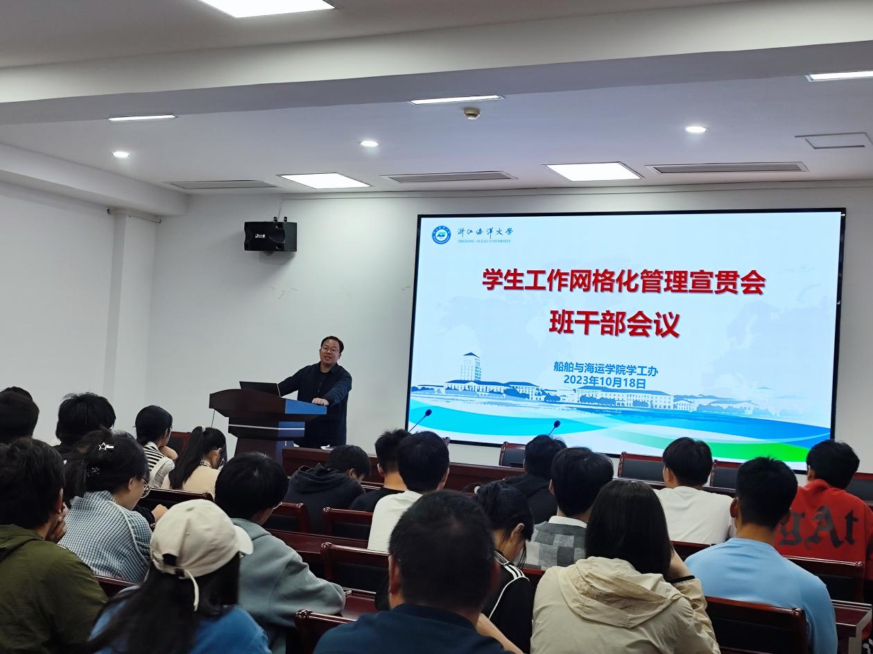 第二项议程,胡金保再次详细介绍了学院——系、专业、年级——班级——寝室等四级学生工作网格化管理模式,分述了班长、安全委员及寝室长在网格中的职责,以及需要承担的责任。他强调,网格化管理模式能否高效、保质运作,完全依赖于网格中各网格长是否尽职尽责,希望各位同学要切实承担起网格责任,充分发挥网格在学生寝室夜查、安全教育管理、意识形态等工作中的积极作用,对苗头性、倾向性问题早发现、早提醒、早报告、早解决,共同维护学院安全稳定。