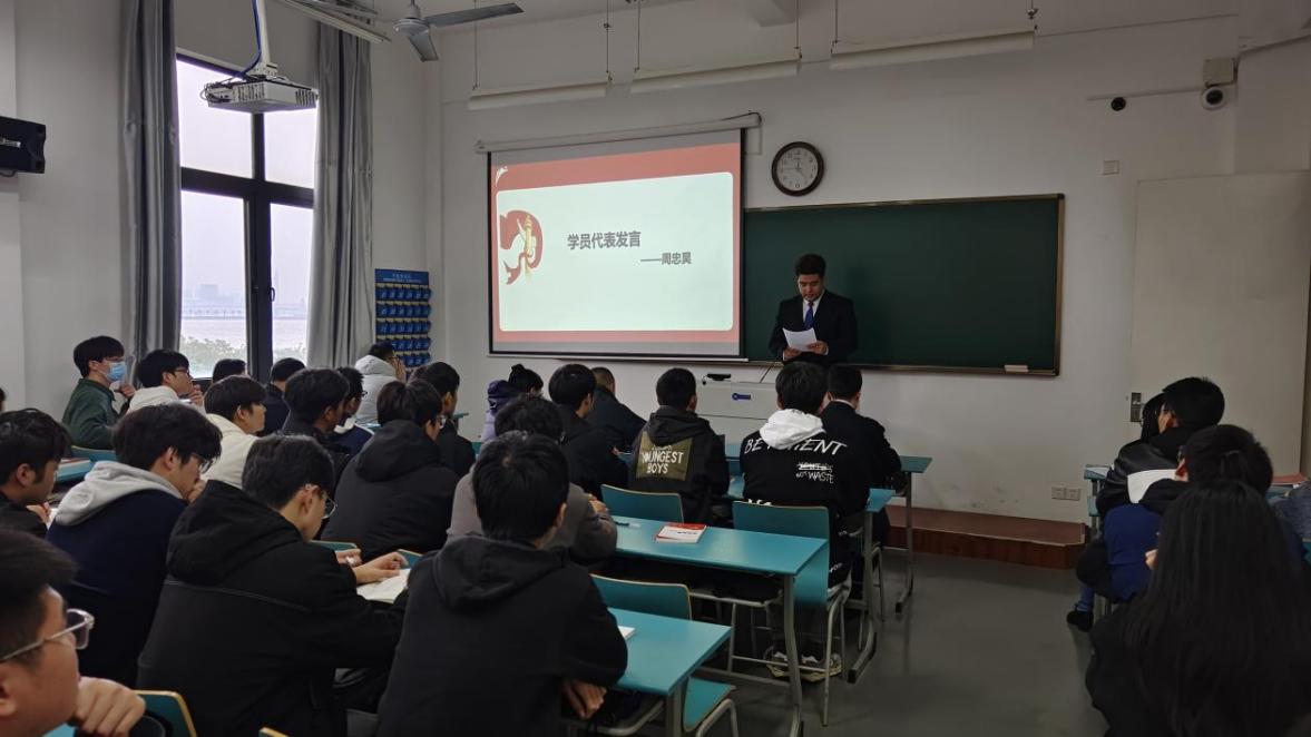 随后,培训班学员代表周忠浩同学进行了发言。发言中,他表达了成为入党积极分子的激动心情,也对党组织庄严承诺,我们将珍惜宝贵的学习机会,在学习生活中以党员的标准严格要求自己,以实际行动争取早日加入中国共产党。
