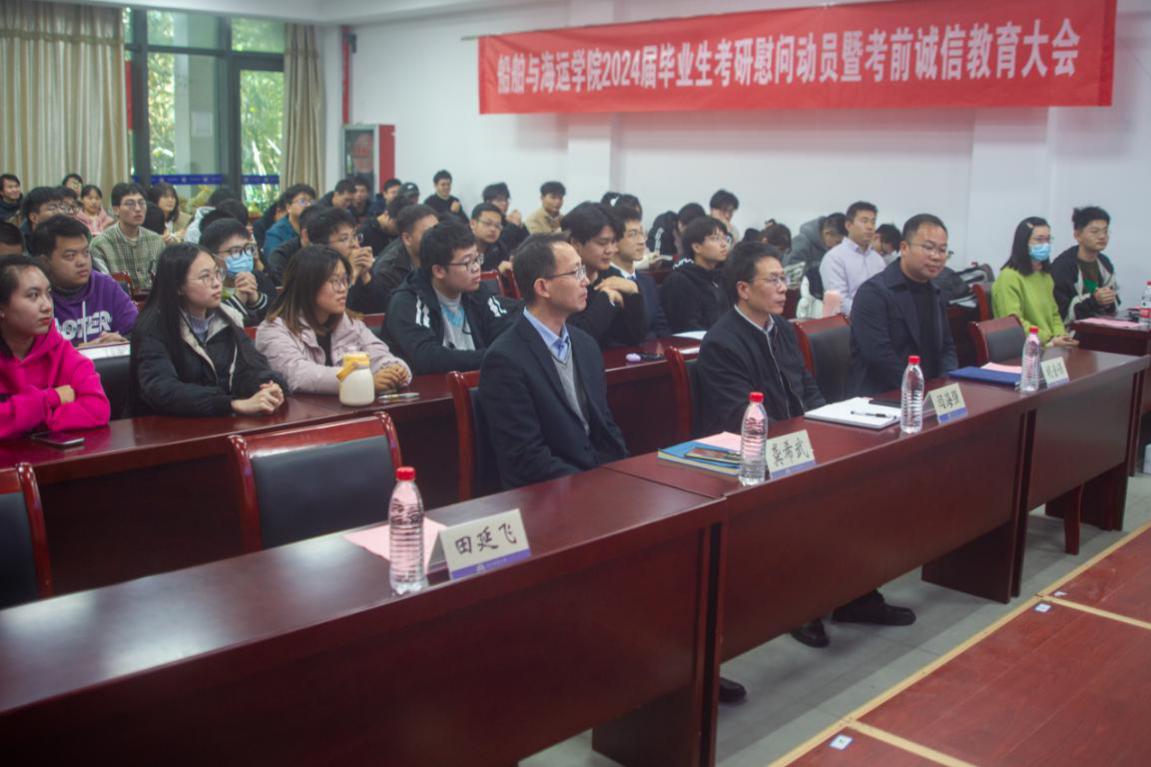 在工科楼120报告厅举行2024届毕业生考研慰问动员暨考前诚信教育大会,学院院长、党委副书记龚希武,党委书记闫海强,党委副书记、纪委书记何晔,学工办主任胡金保,班主任代表田延飞,以及就业辅导员,2024届部分考研学生代表参加大会,大会由党委副书记、纪委书记何晔主持。
