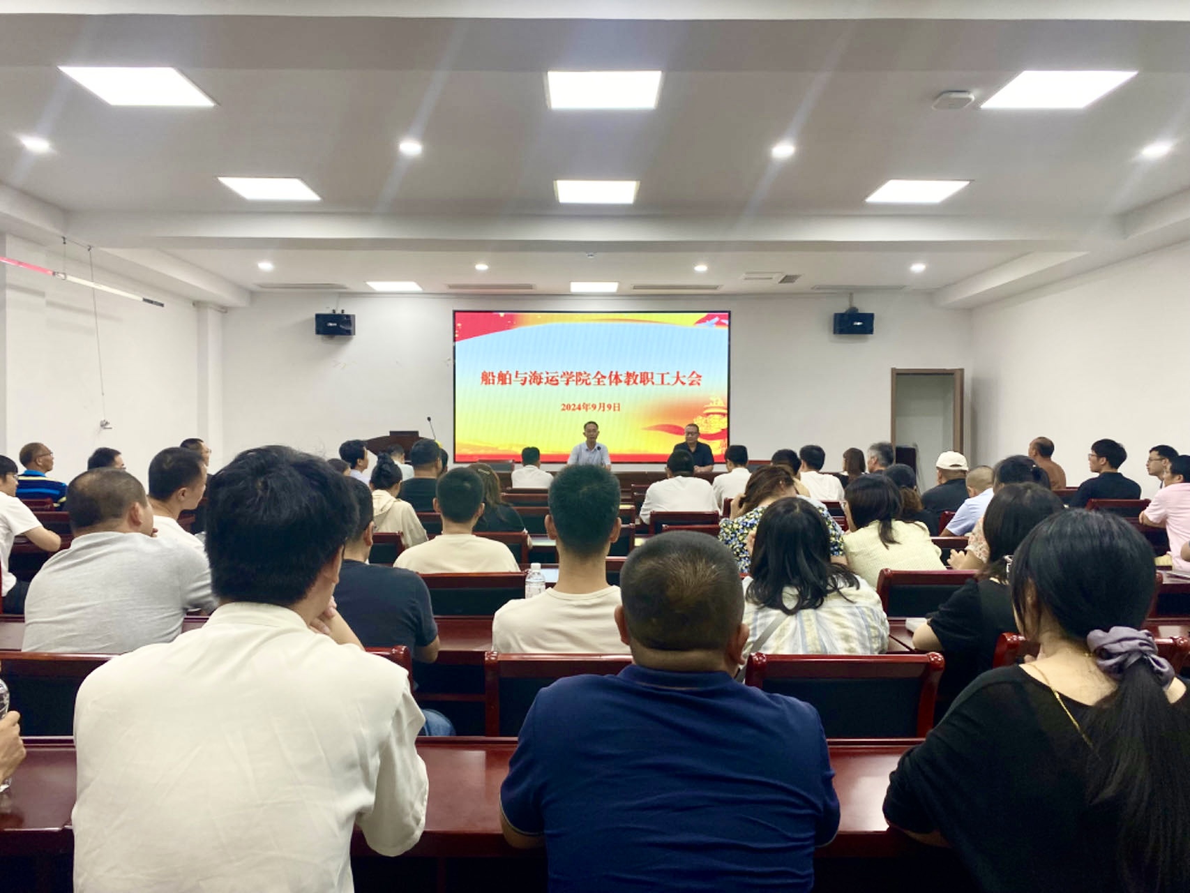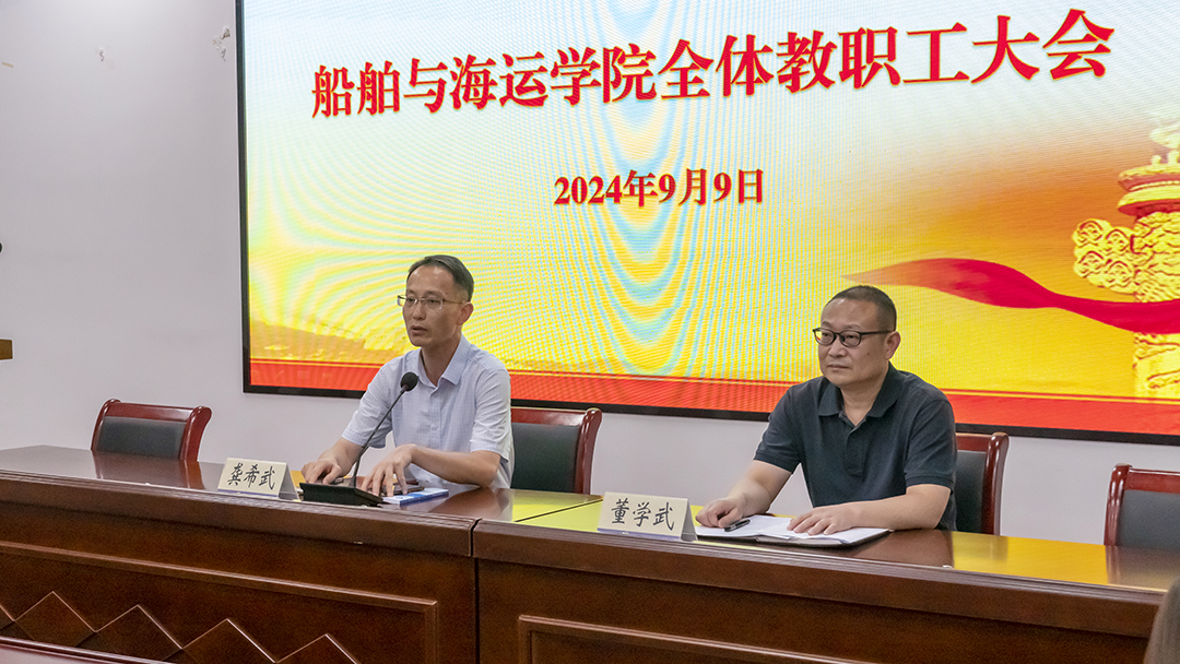 党委书记董学武向全体教职工传达了党的二十届三中全会精神、省委十五届五次全会精神、学校新学期中层干部会议精神以及纪委工作例会精神,并针对新学期工作提出三点意见:第一,要守土有责保稳定。全体教职工要时刻绷紧安全稳定这根弦,加强风险隐患分析研判和排查整改,筑牢思想防线,明确制度红线,坚守廉洁底线,确保守土有责、寸土不失。第二,要实干担当抓落实。教师的工作质量与学院的发展休戚与共,希望全体教职工勠力同心,克服困难,圆满完成各项工作任务。第三,要齐心协力促发展。要抢抓机遇、及早谋划,不断提升学科能力、专业素养和管理质效,加快推动学院教育层次的转型升级,以船运学院一域之力为学校发展全局增光添彩,在建设高水平海洋大学的新征程中交出高分答卷!