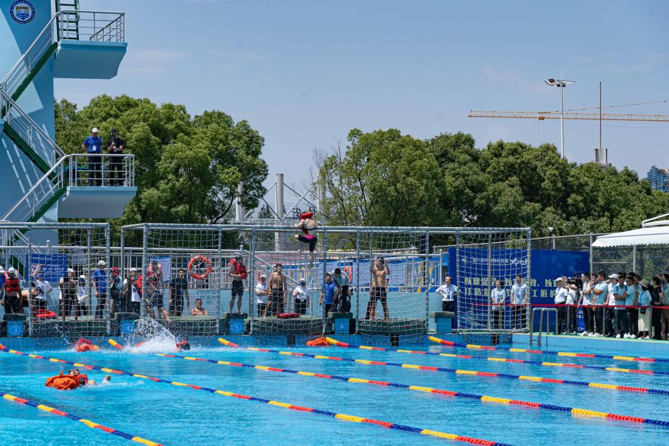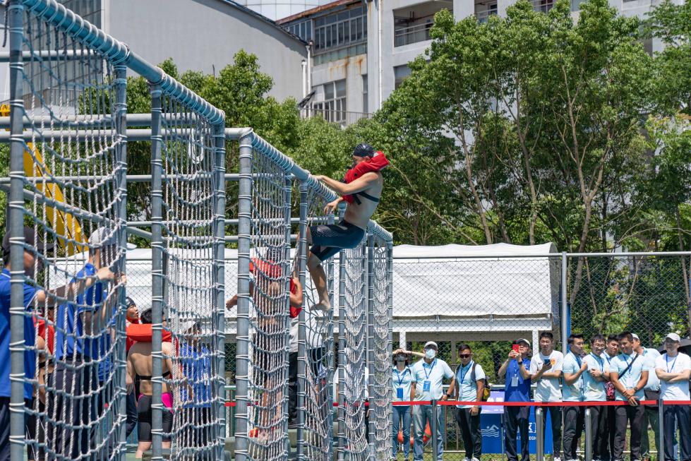 铁人三项接力项目需要速度、耐力及队员们的配合,是大比武中最具观赏性和竞技性的赛事。训练和比赛时需要队员完成50M穿救生衣游泳、50M拖带20KG假人和翻越3M绳网,对于心肺耐力是极大的挑战,队员不断突破自己,在国赛中创造佳绩。